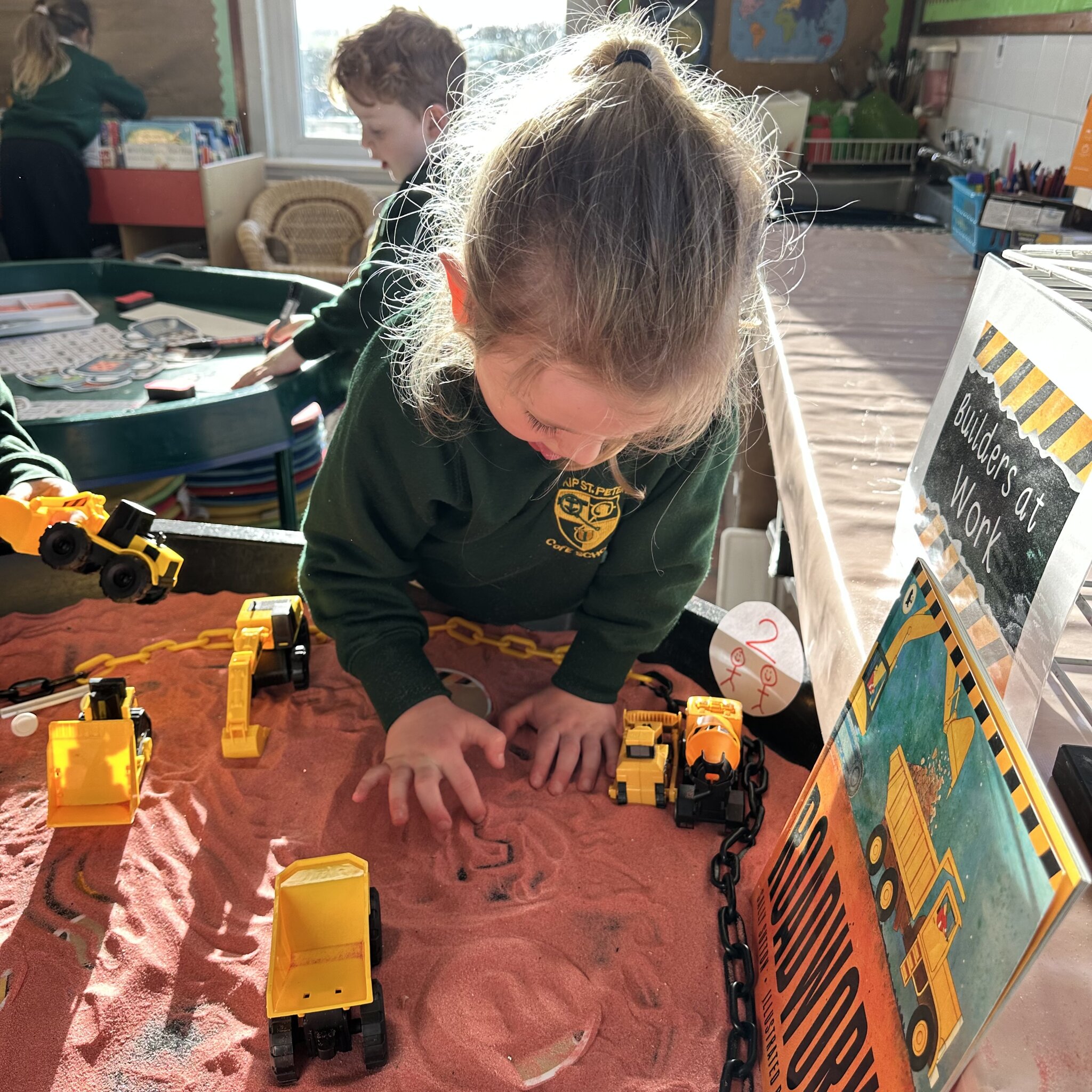 Our Reception children have been busy building their number sense this week by digging through the sand to find numbers that were hidden. Once they found them they practised forming the numbers in the sand and then had to bury the number again by tipping the number shown in buckets of sand over it!