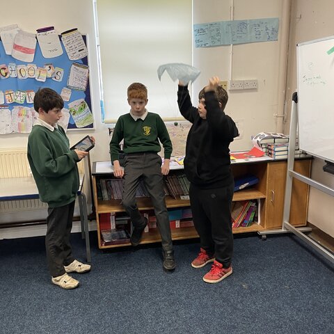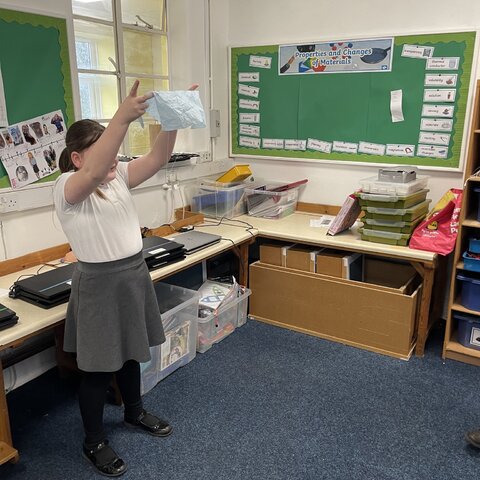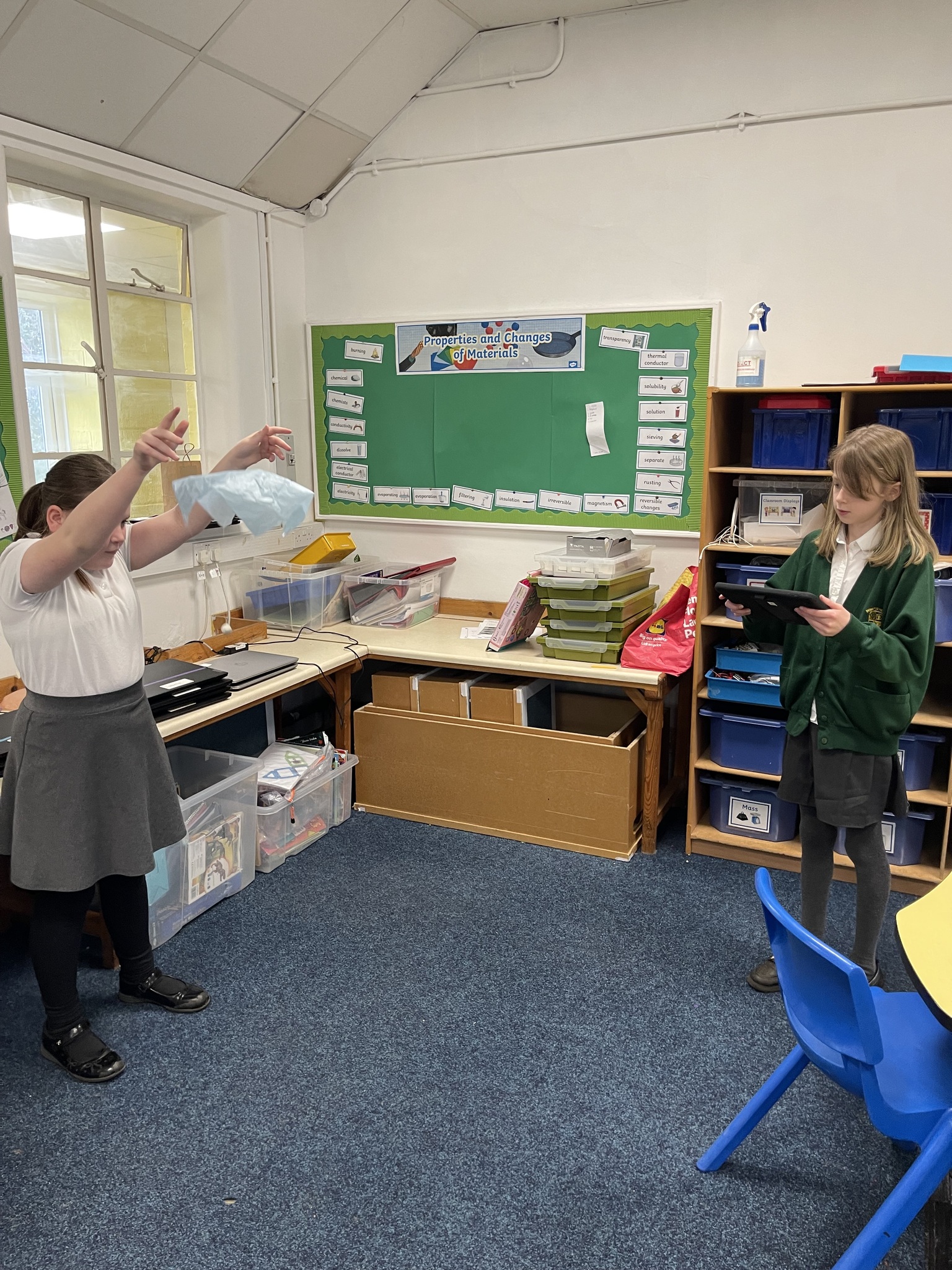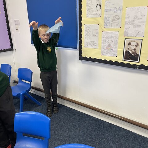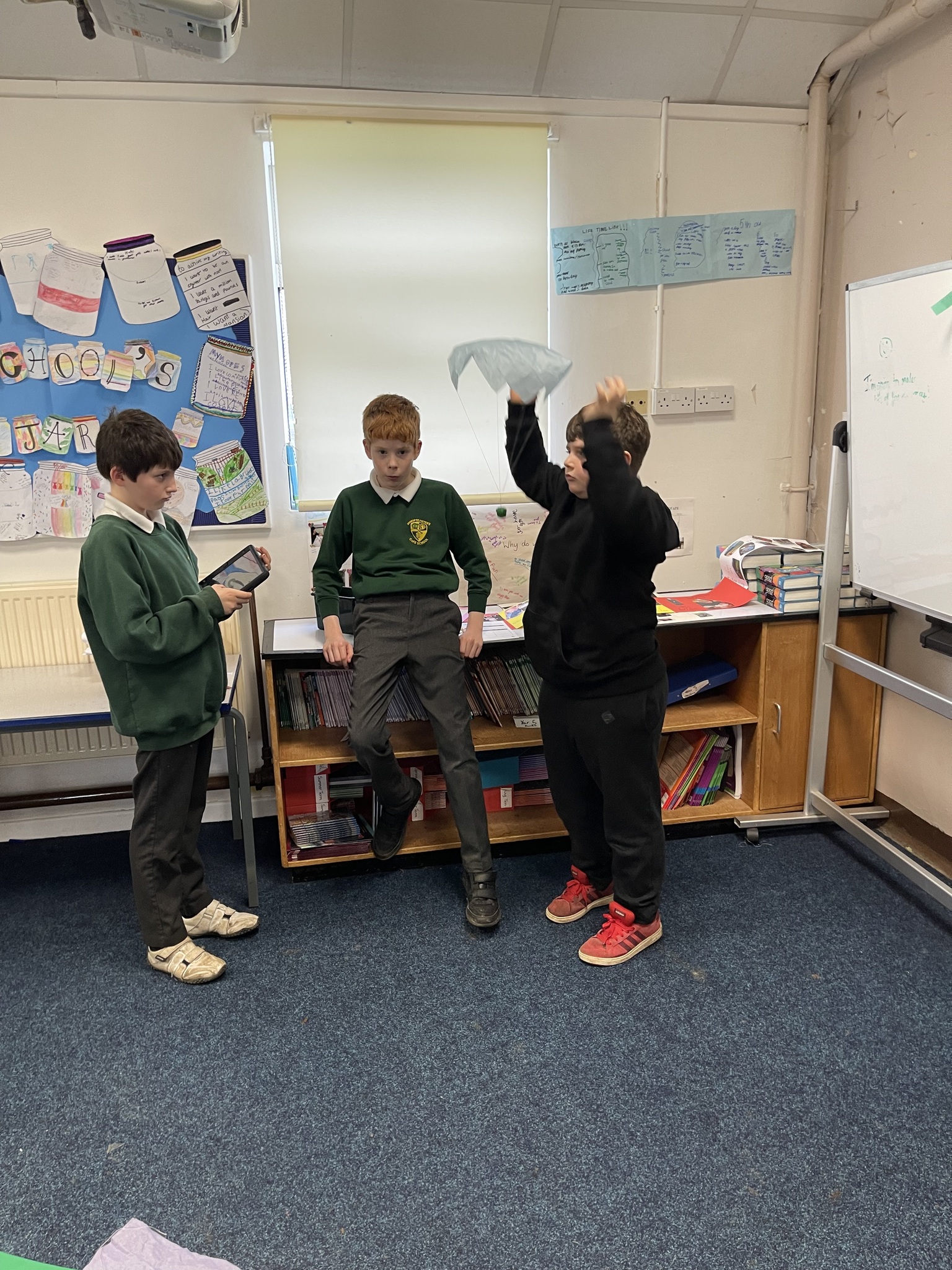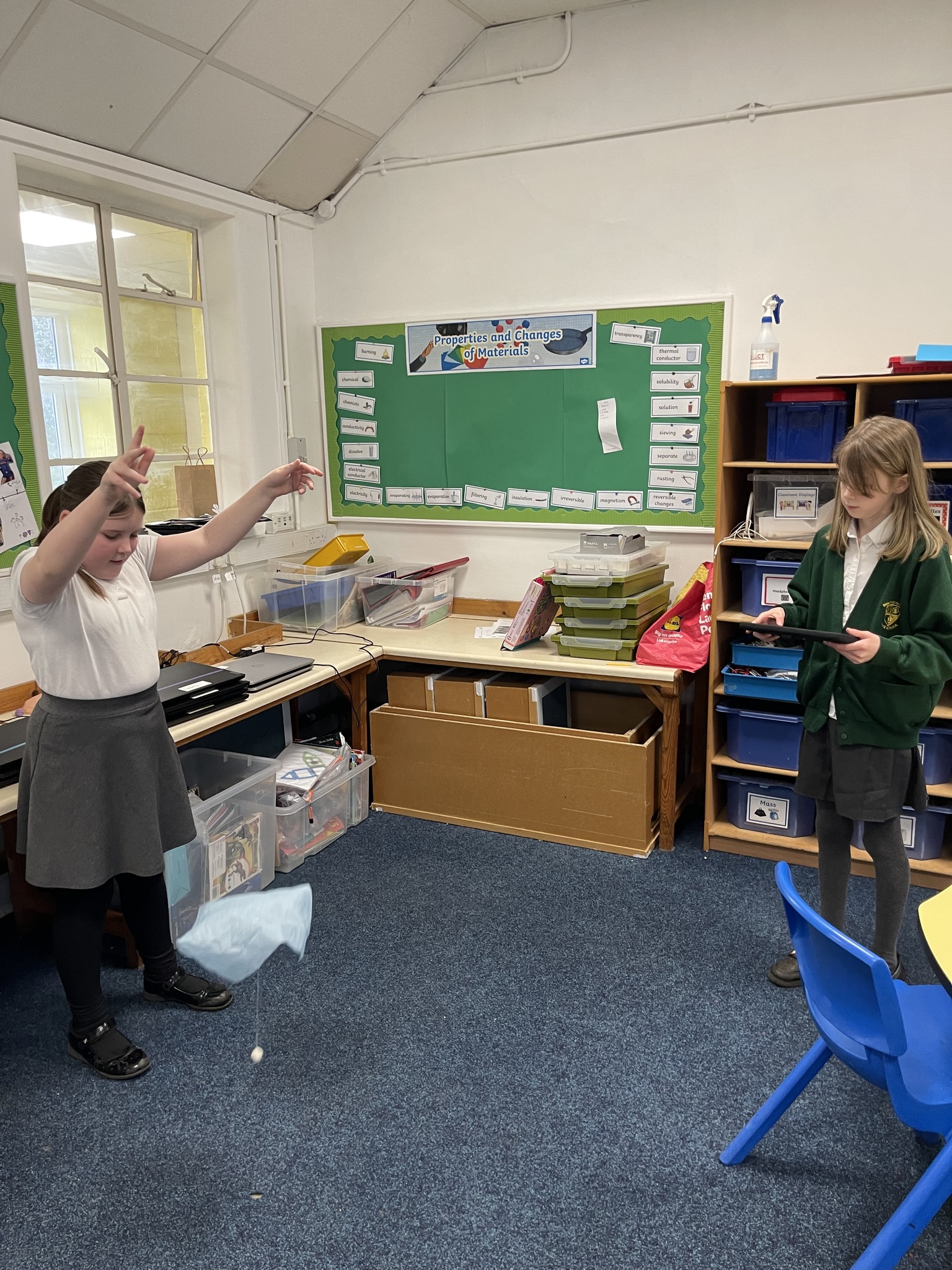 In our last session learning about forces, Upper School conducted an experiment to test different sized parachutes. They cut out tissue paper squares of differing lengths (14cm, 20cm, 30cm) and hung playdoh from them to represent the weight of a person. Each group then measured the length of time it took each parachute to hit the ground. All the children found the largest parachute stayed in the air for the longest. The conclusion was then made that this happened because of the friction force, air resistance, being greatest underneath the largest area of tissue paper.
