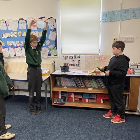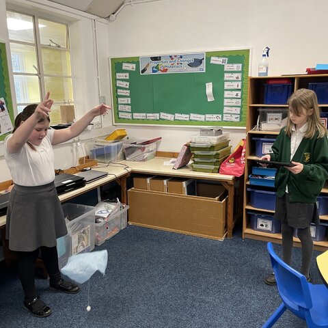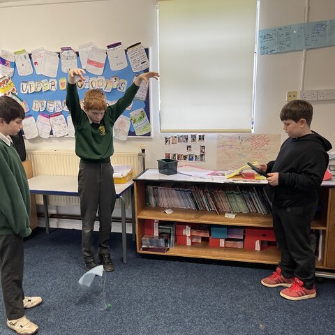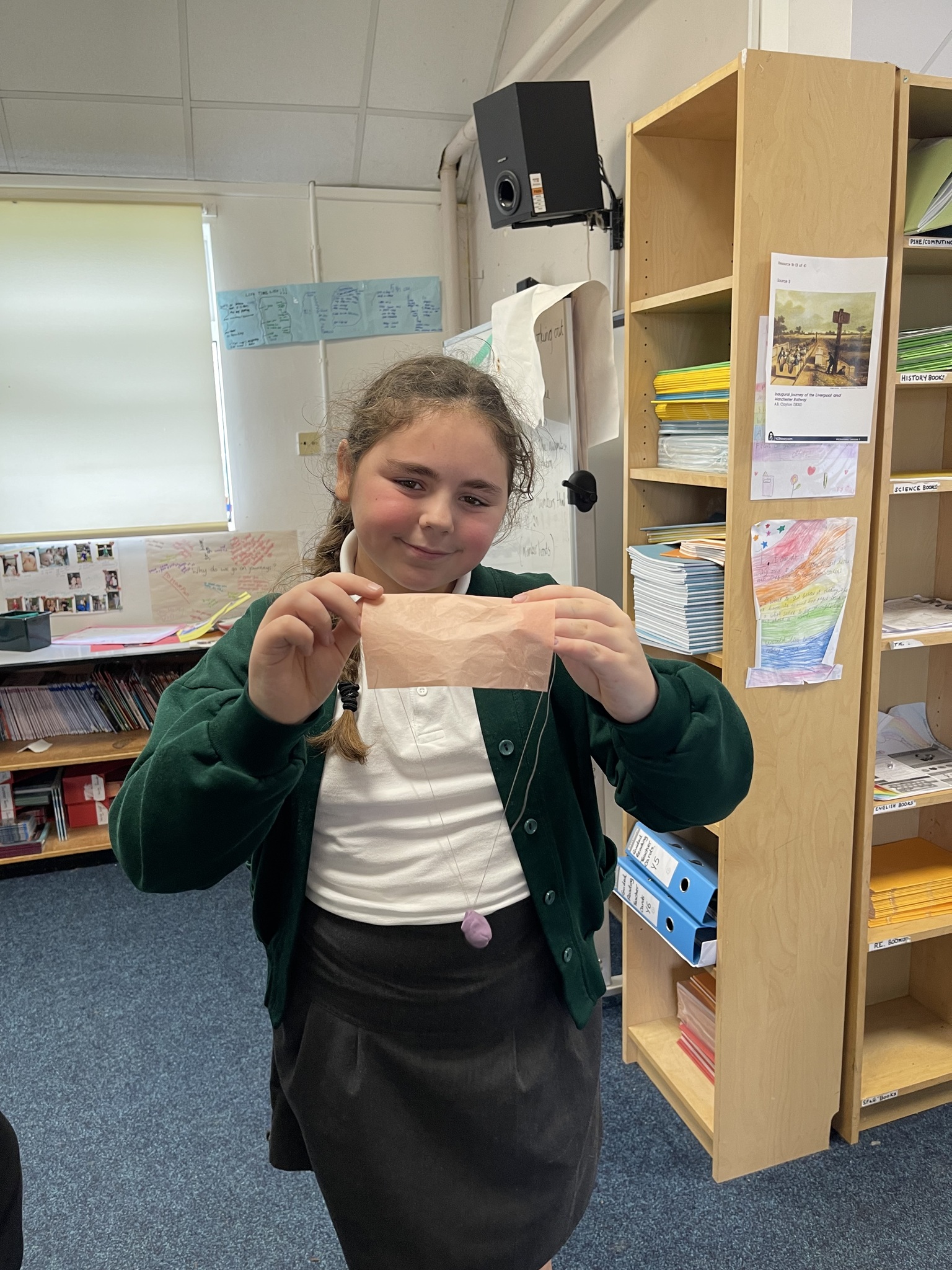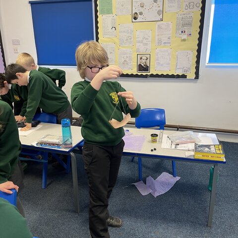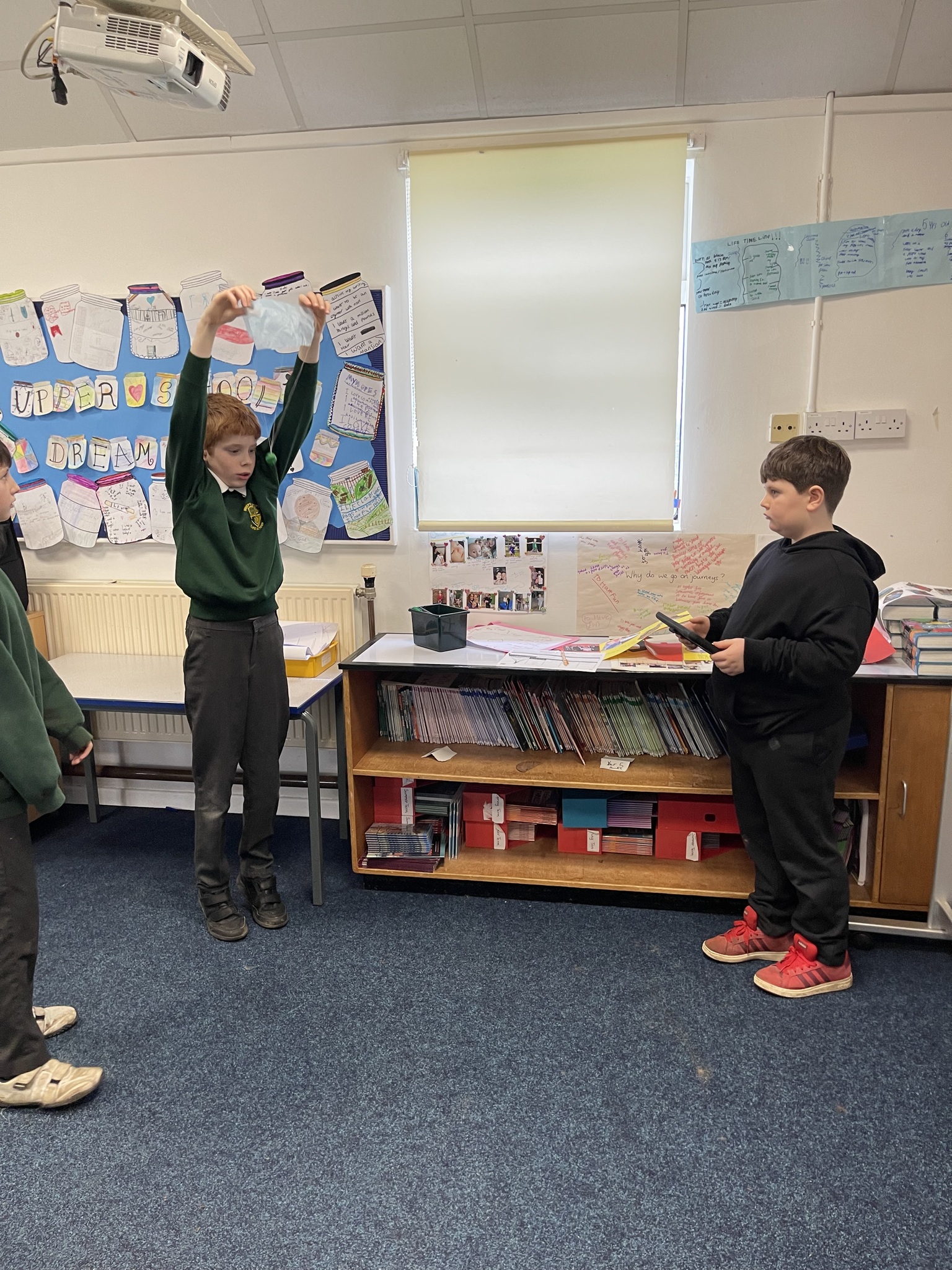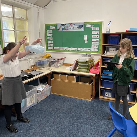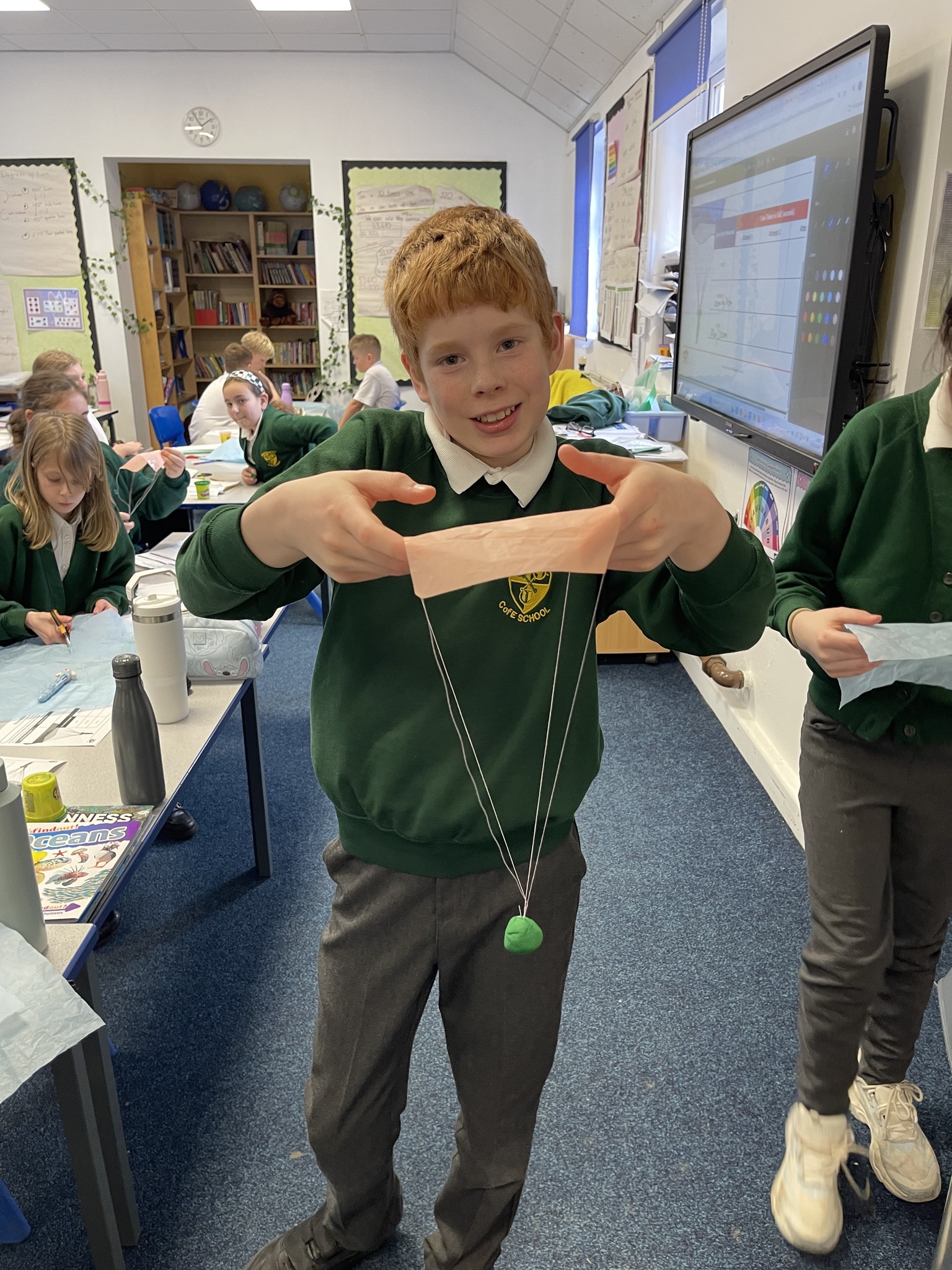 In our last session learning about forces, Upper School conducted an experiment to test different sized parachutes. They cut out tissue paper squares of differing lengths (14cm, 20cm, 30cm) and hung playdoh from them to represent the weight of a person. Each group then measured the length of time it took each parachute to hit the ground. All the children found the largest parachute stayed in the air for the longest. The conclusion was then made that this happened because of the friction force, air resistance, being greatest underneath the largest area of tissue paper.