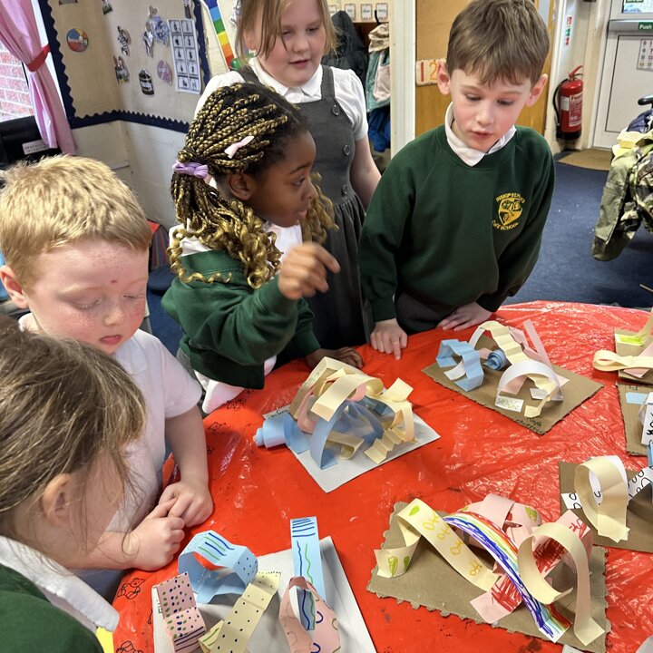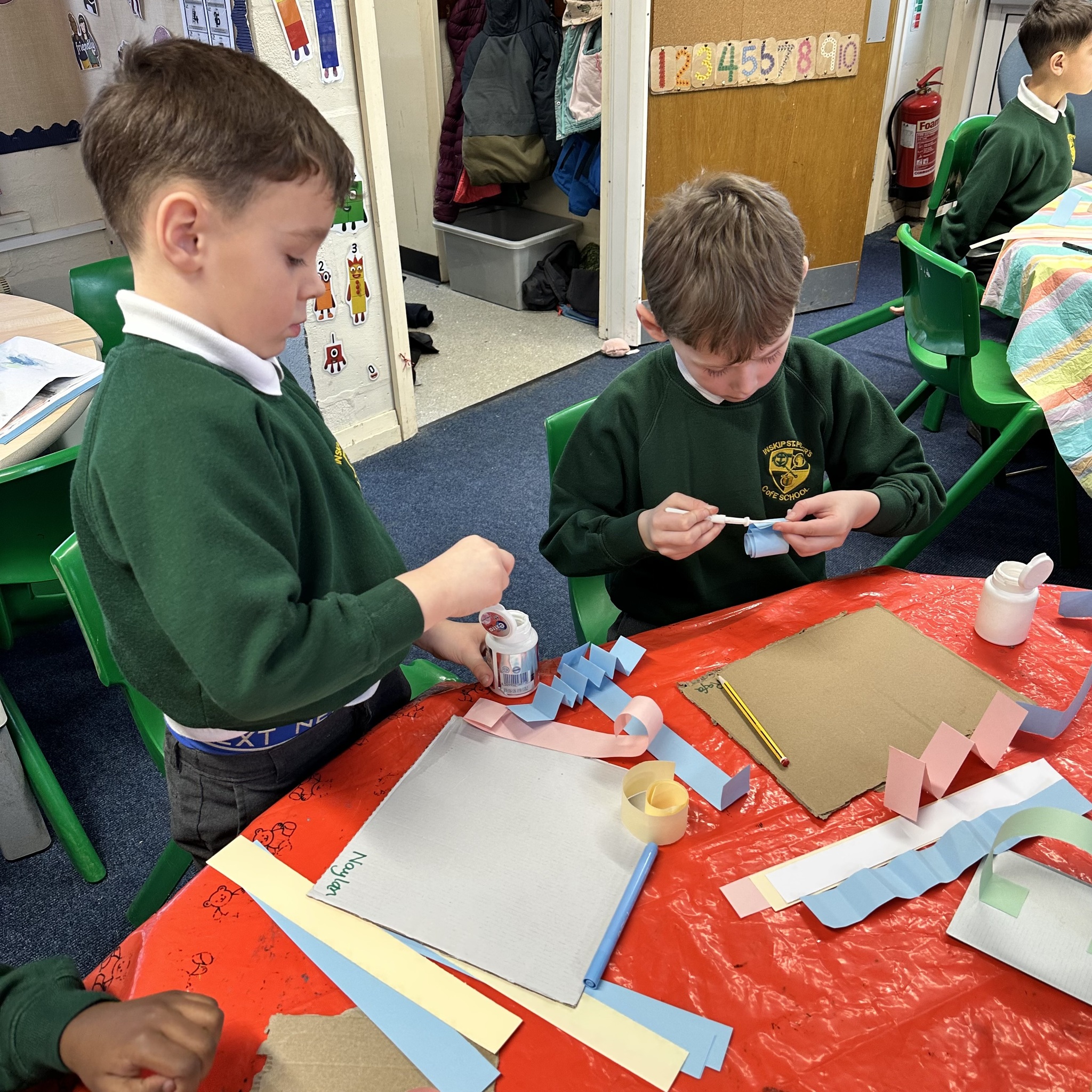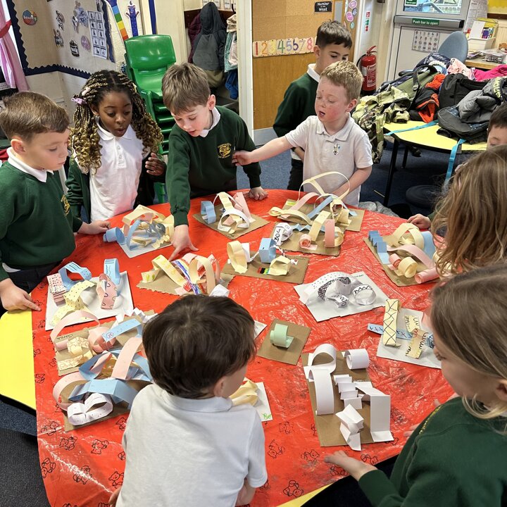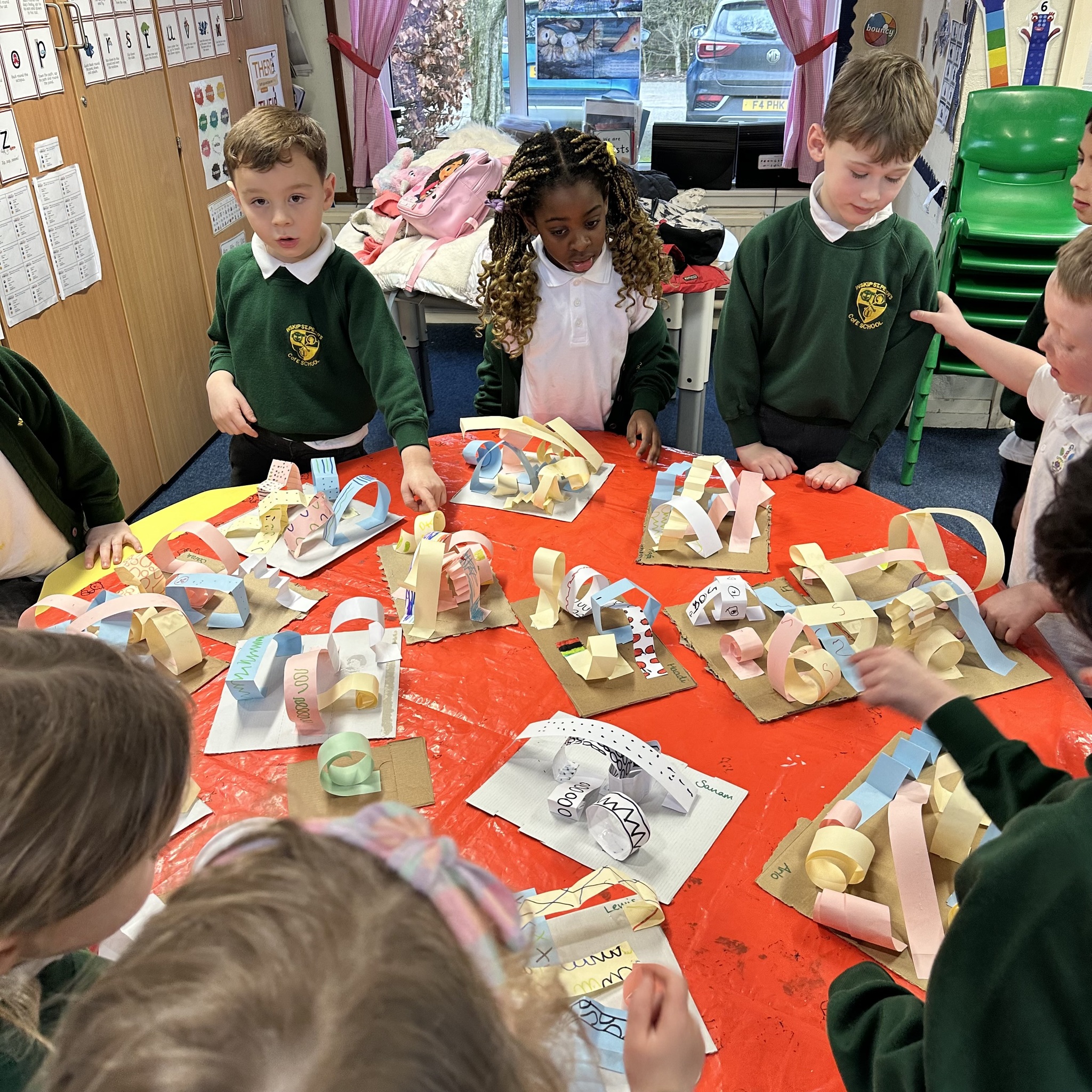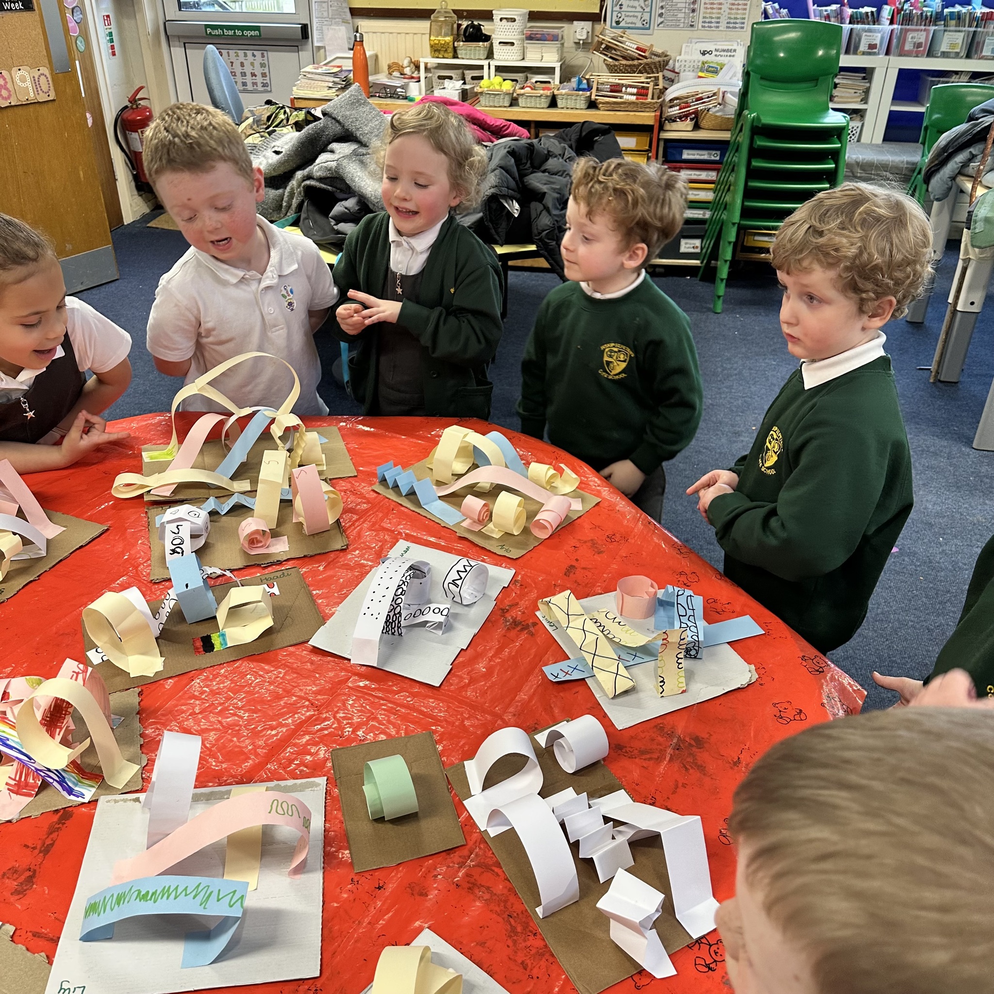 In the second lesson of our sculpture project last half term the year 1 and 2 children learnt how to shape paper to make a 3D drawing.