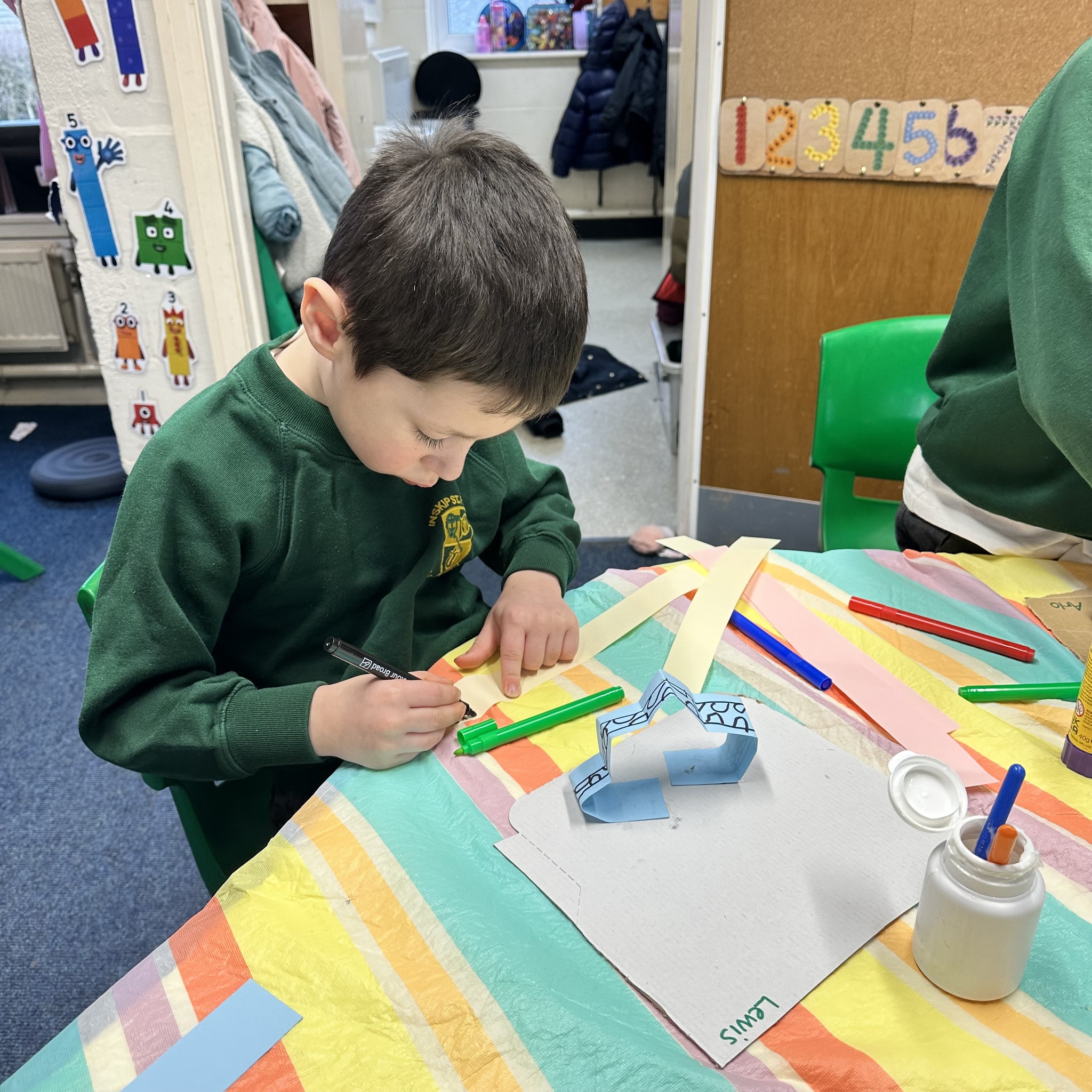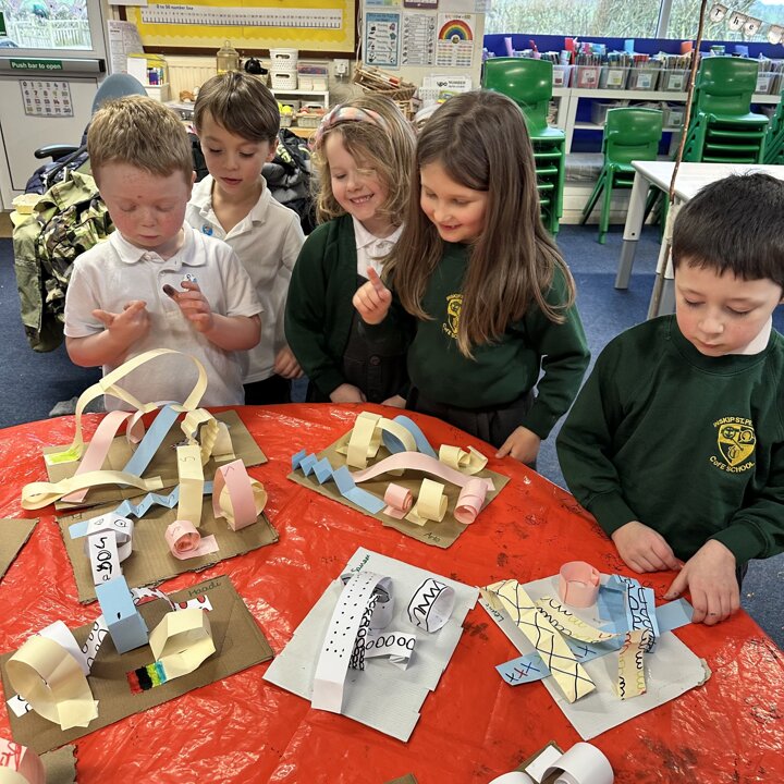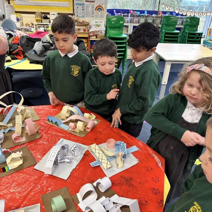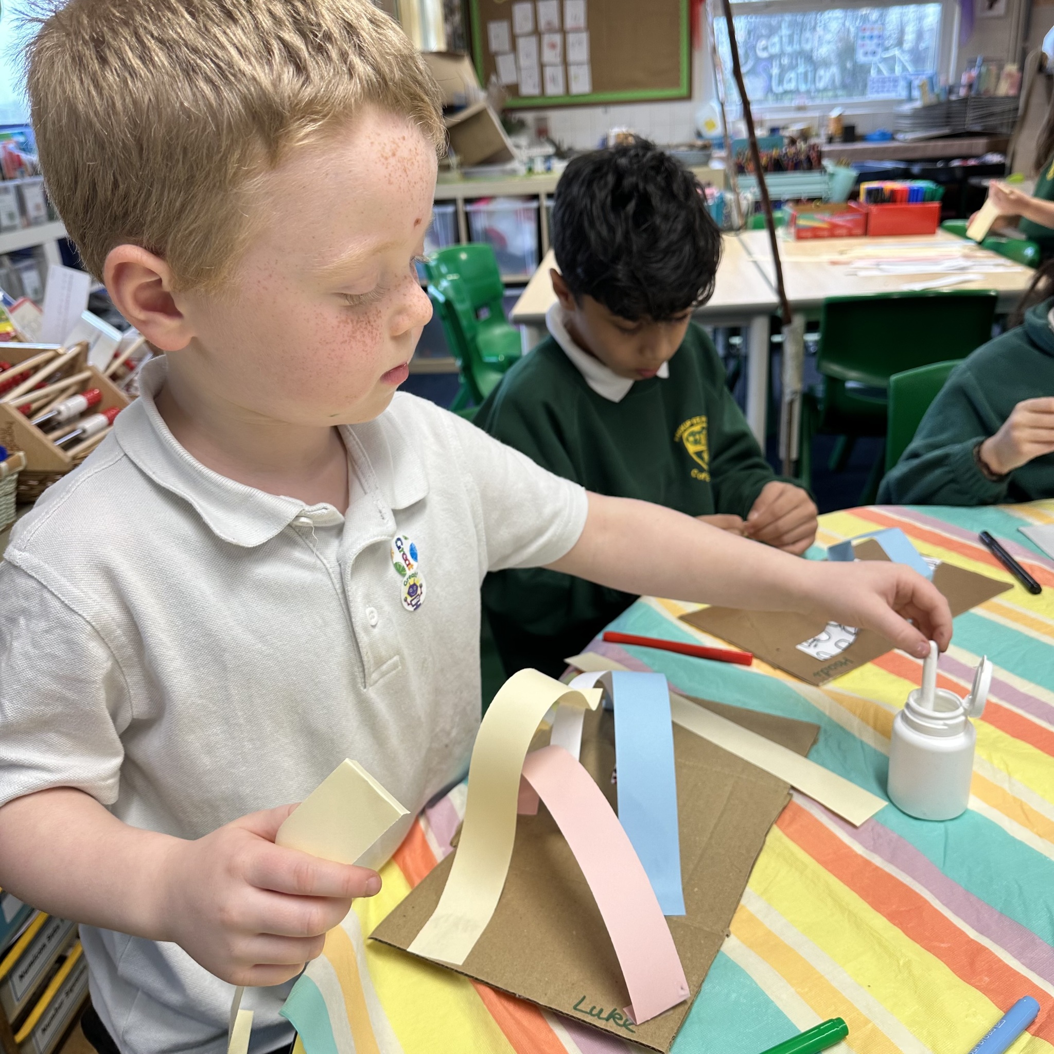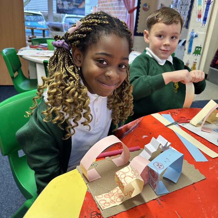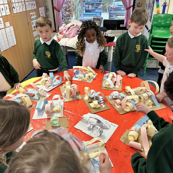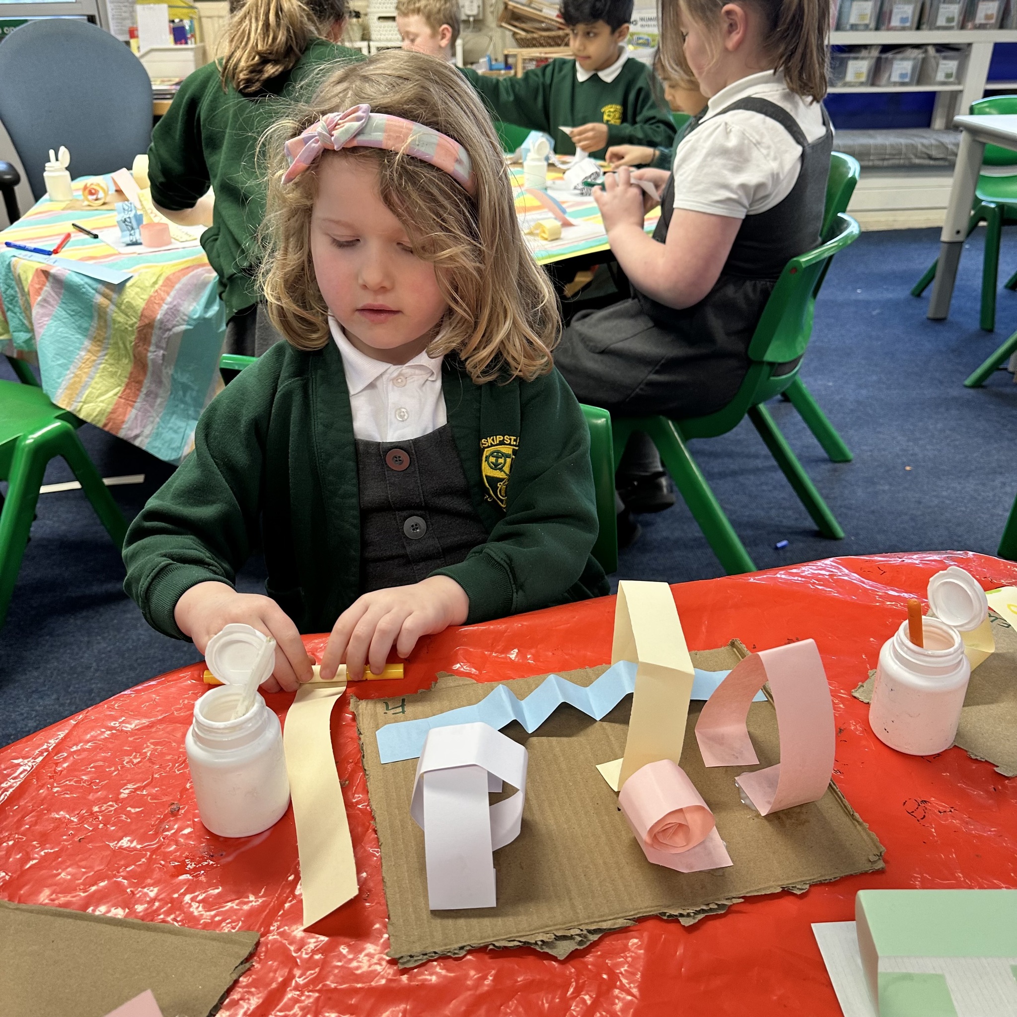 In the second lesson of our sculpture project last half term the year 1 and 2 children learnt how to shape paper to make a 3D drawing.