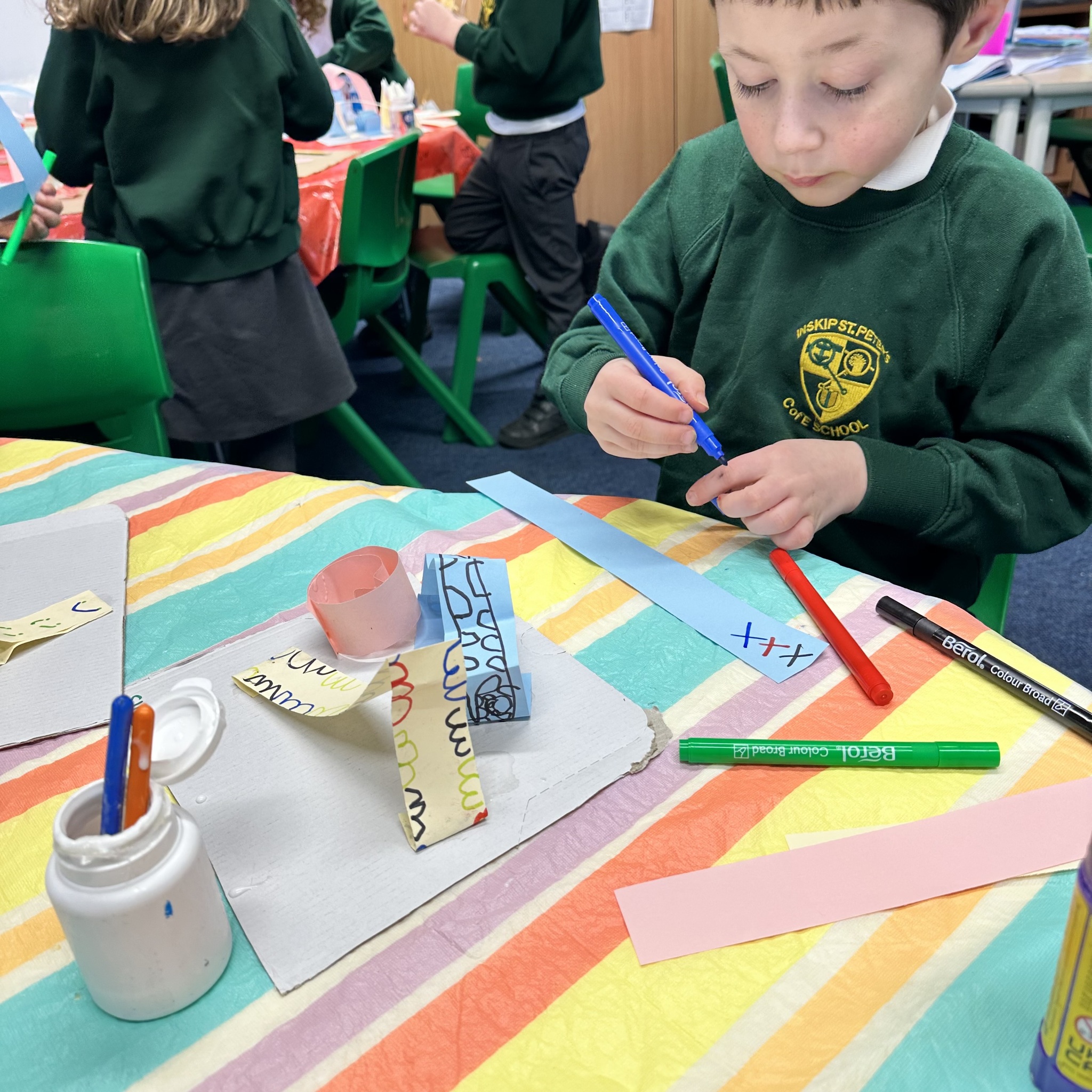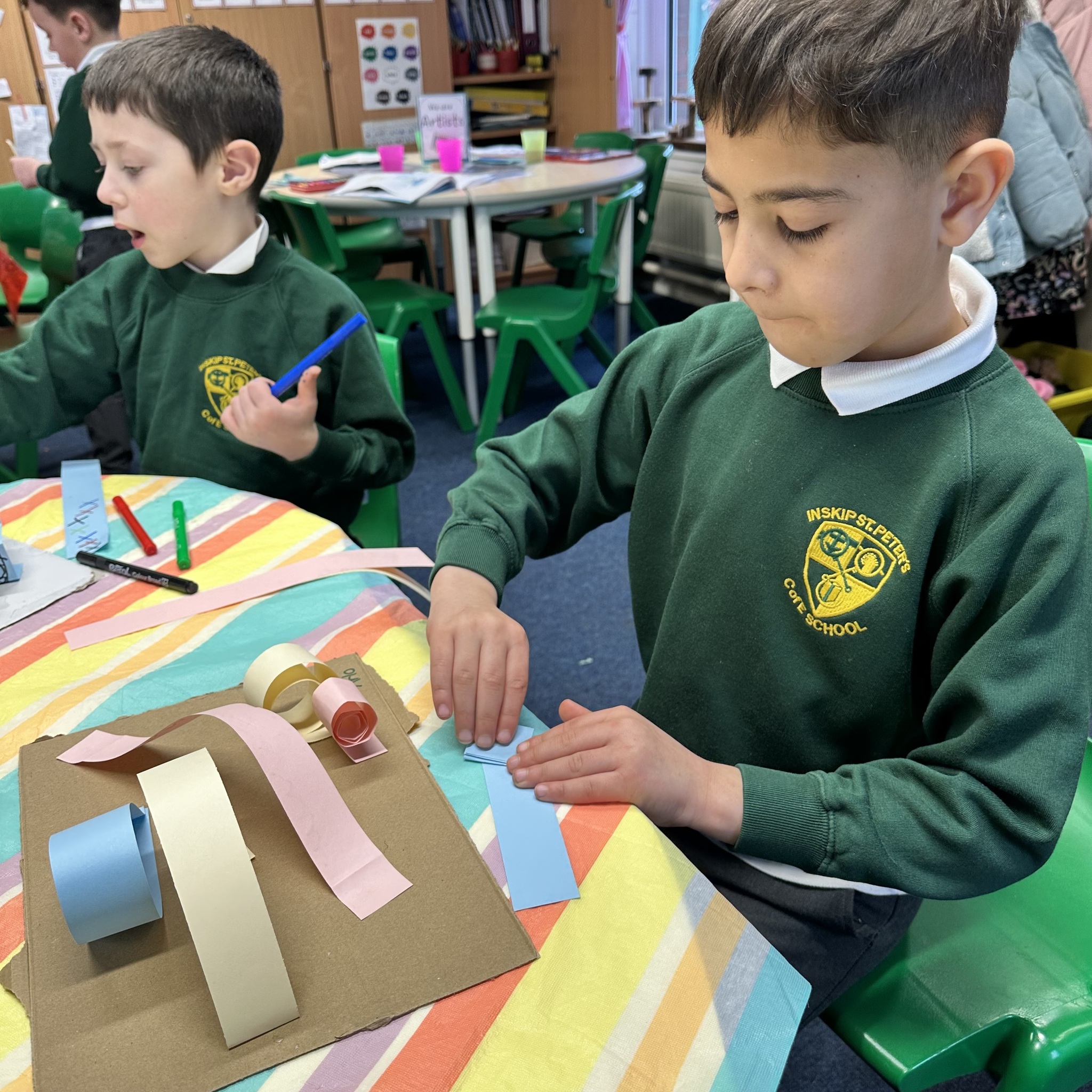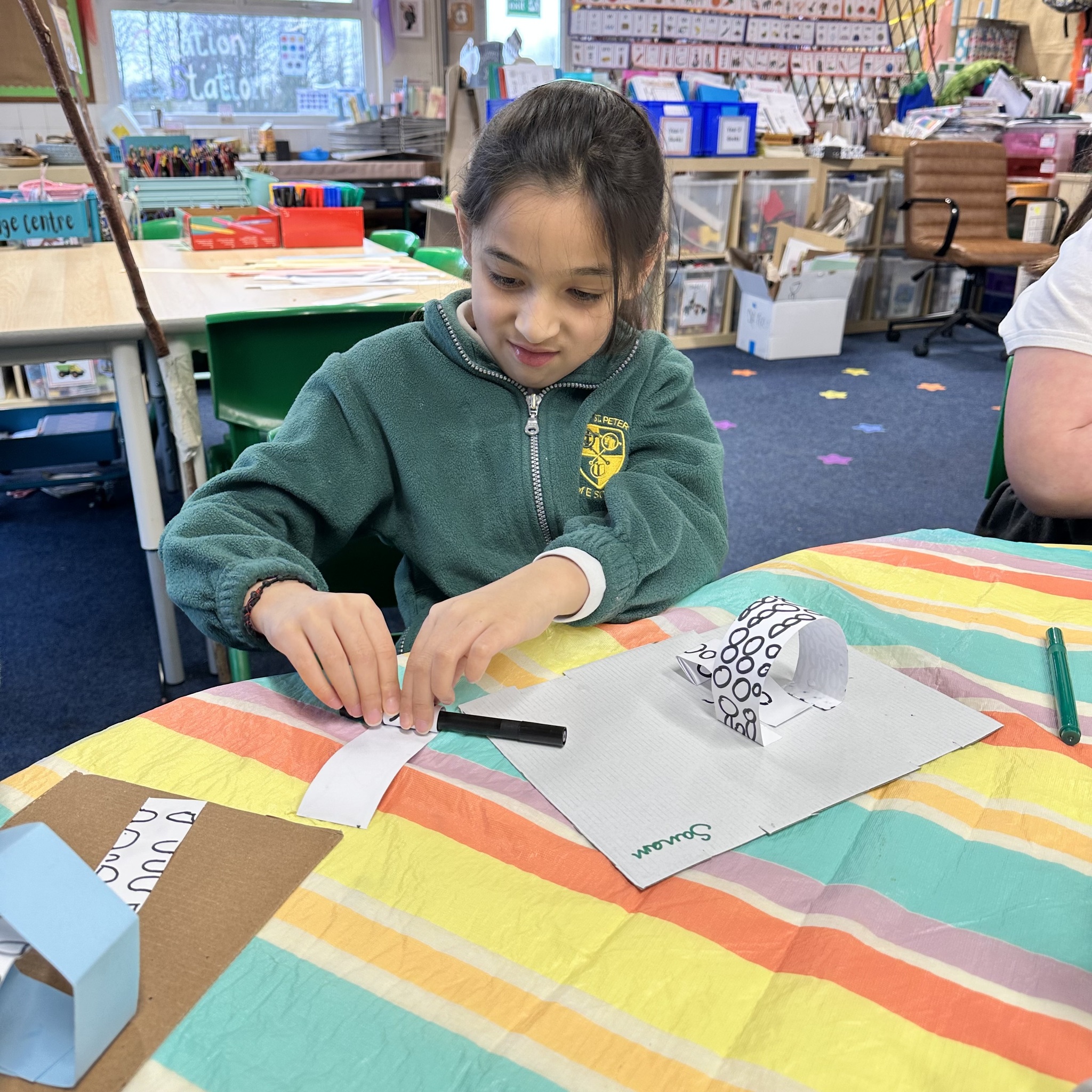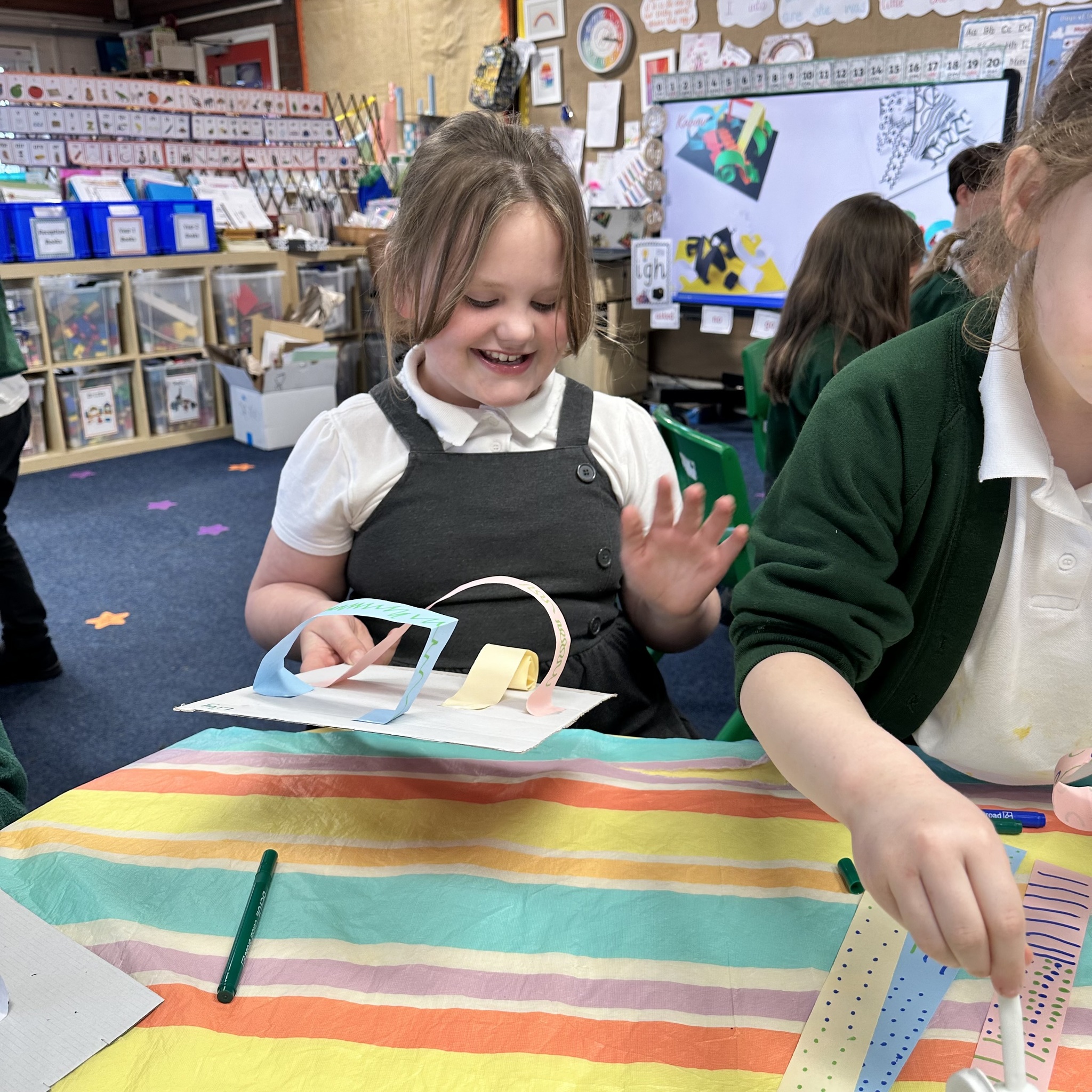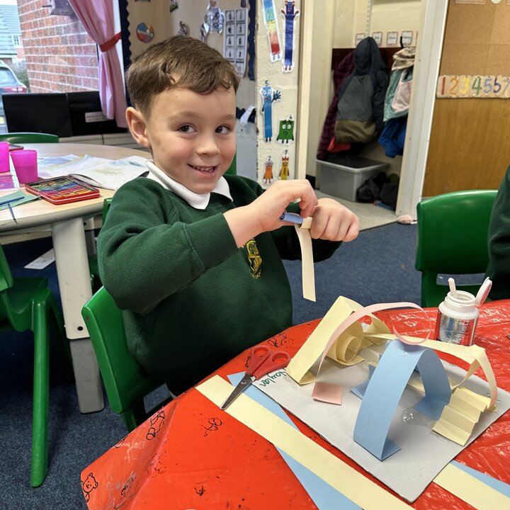 In the second lesson of our sculpture project last half term the year 1 and 2 children learnt how to shape paper to make a 3D drawing.
