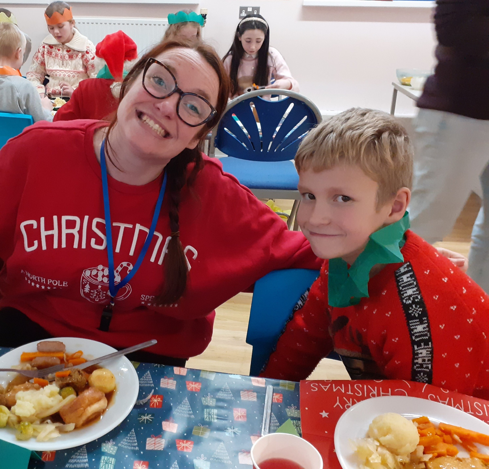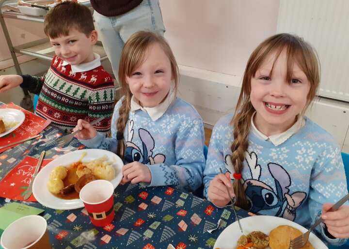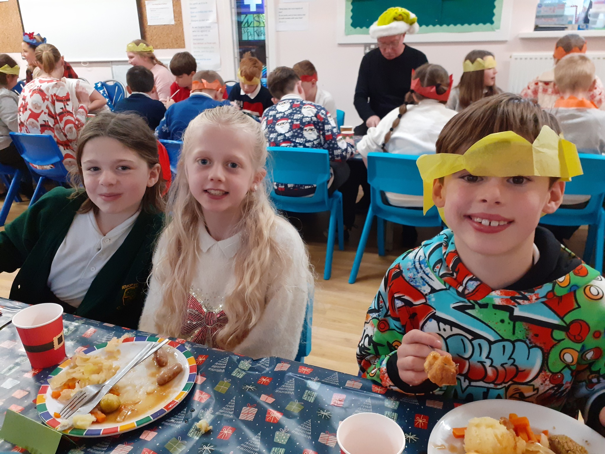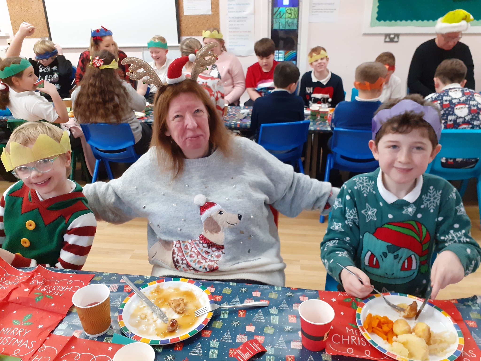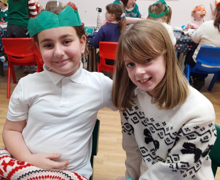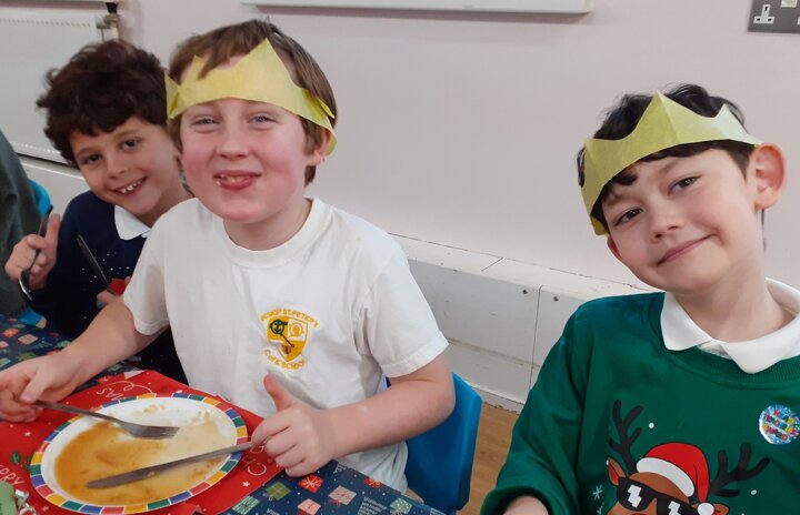 What a great Christmas dinner we ate today! We love our party day; prior to class parties we have a whole school Christmas Dinner where our school community sit together, as you can see in the photos, and our wonderful cook Mrs Billington makes a full Christmas dinner which we all thoroughly enjoy. An extra kindness is that members of our Friends Association kindly volunteer to serve the food too which is a lovely touch. Thank you so much Mrs Billington and our Friends.