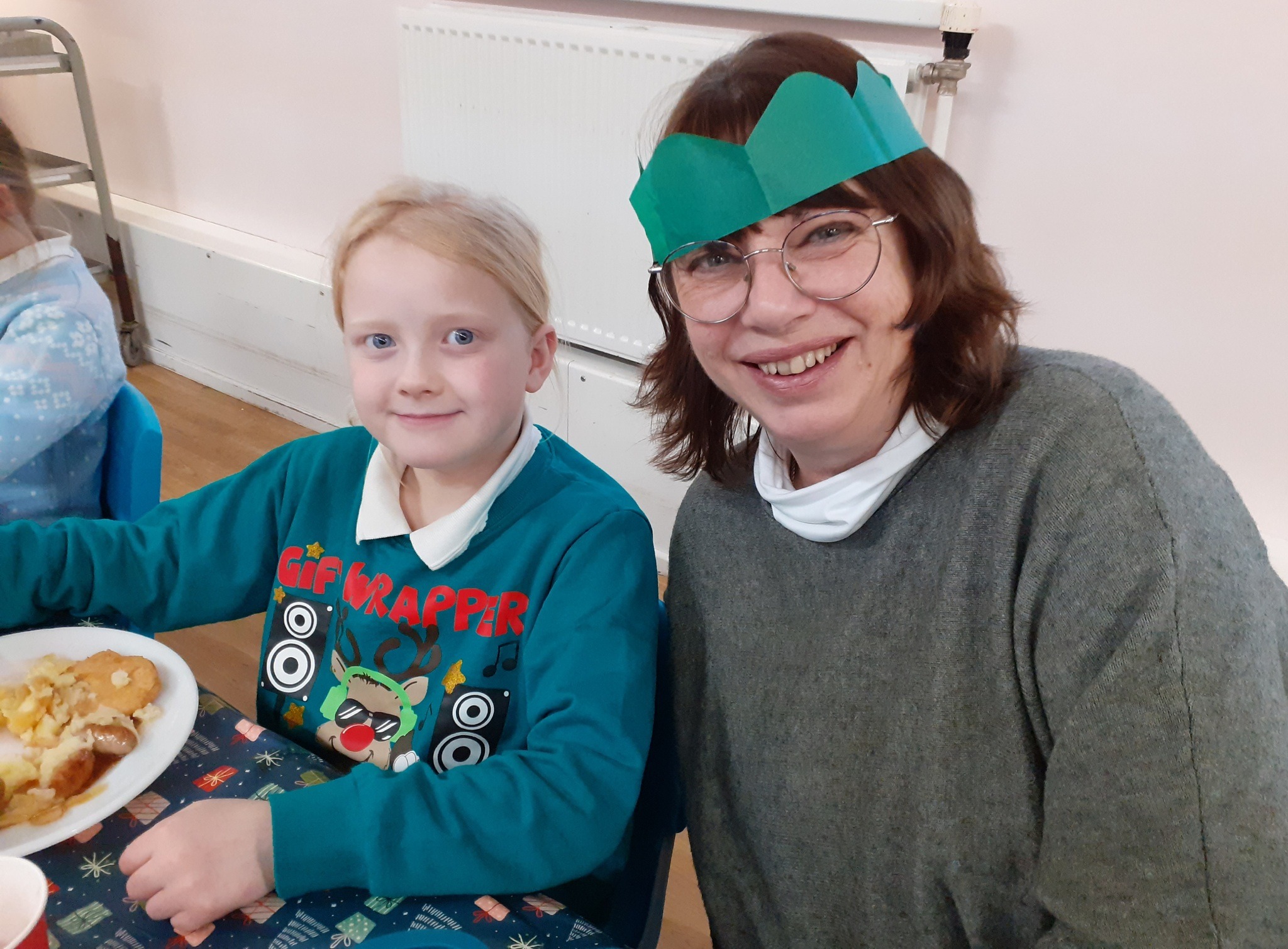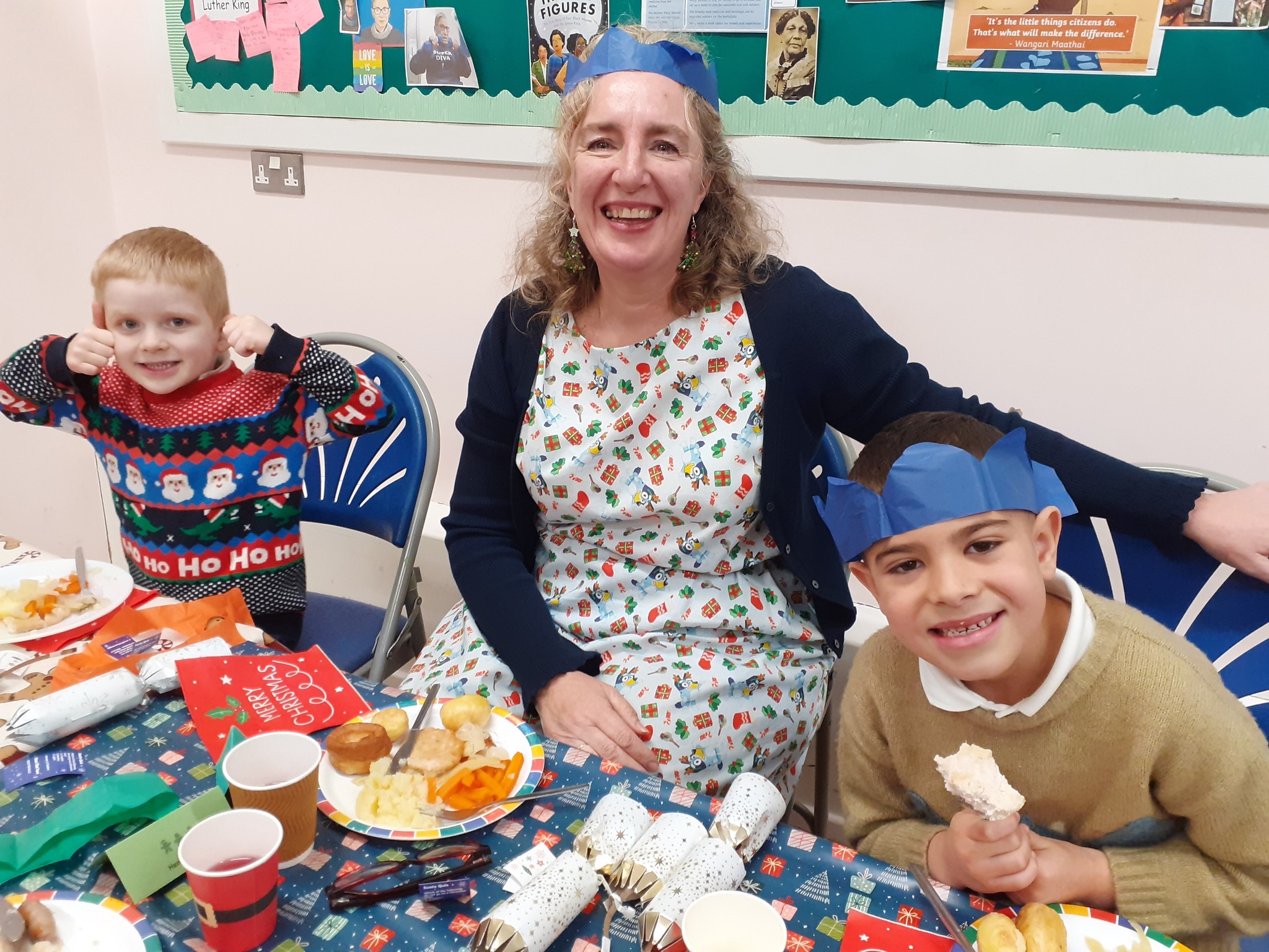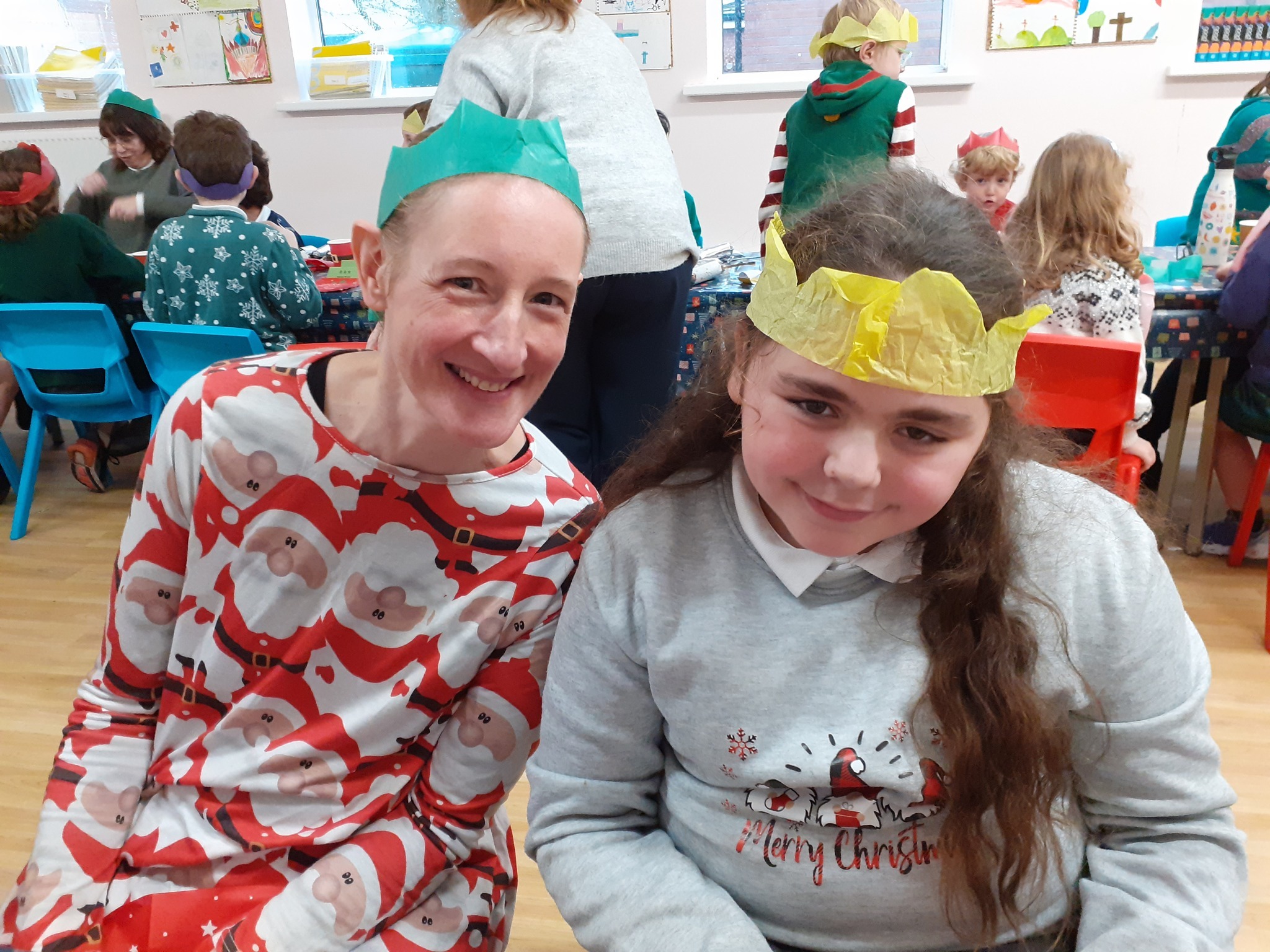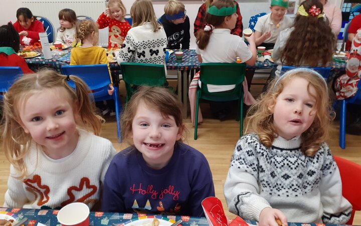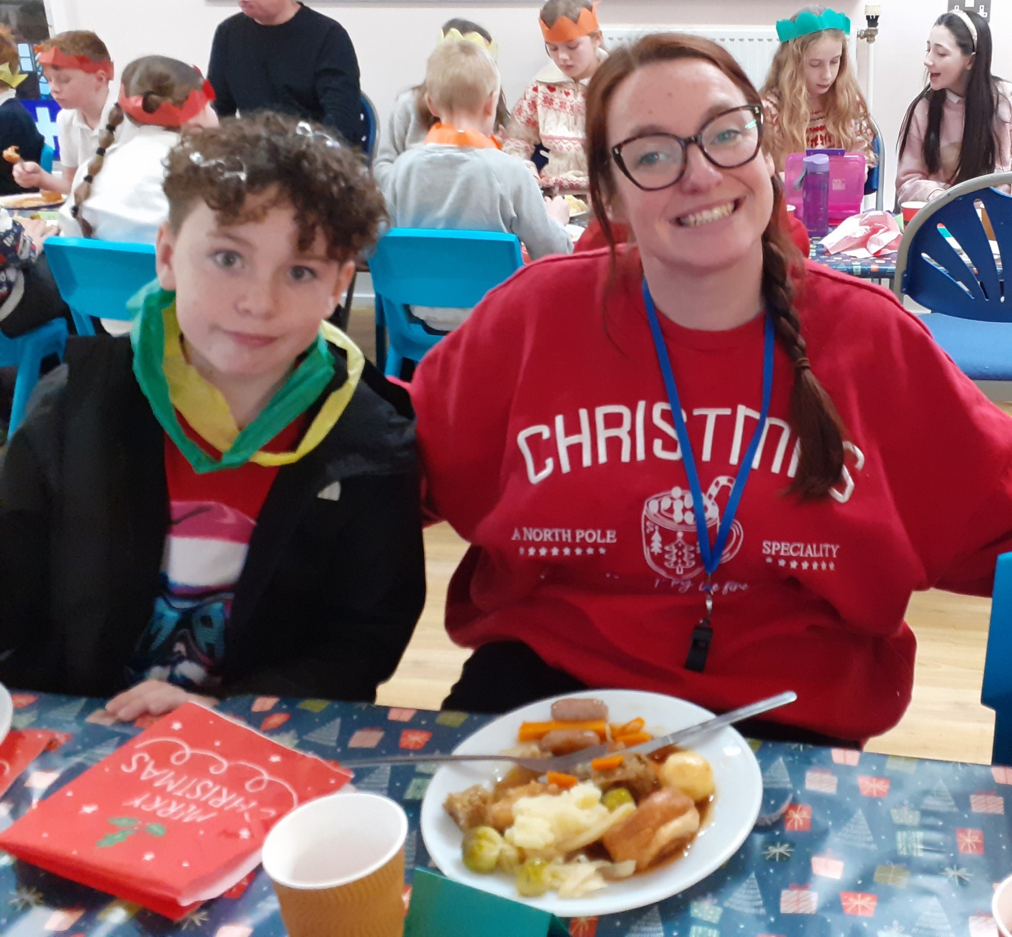 What a great Christmas dinner we ate today! We love our party day; prior to class parties we have a whole school Christmas Dinner where our school community sit together, as you can see in the photos, and our wonderful cook Mrs Billington makes a full Christmas dinner which we all thoroughly enjoy. An extra kindness is that members of our Friends Association kindly volunteer to serve the food too which is a lovely touch. Thank you so much Mrs Billington and our Friends.