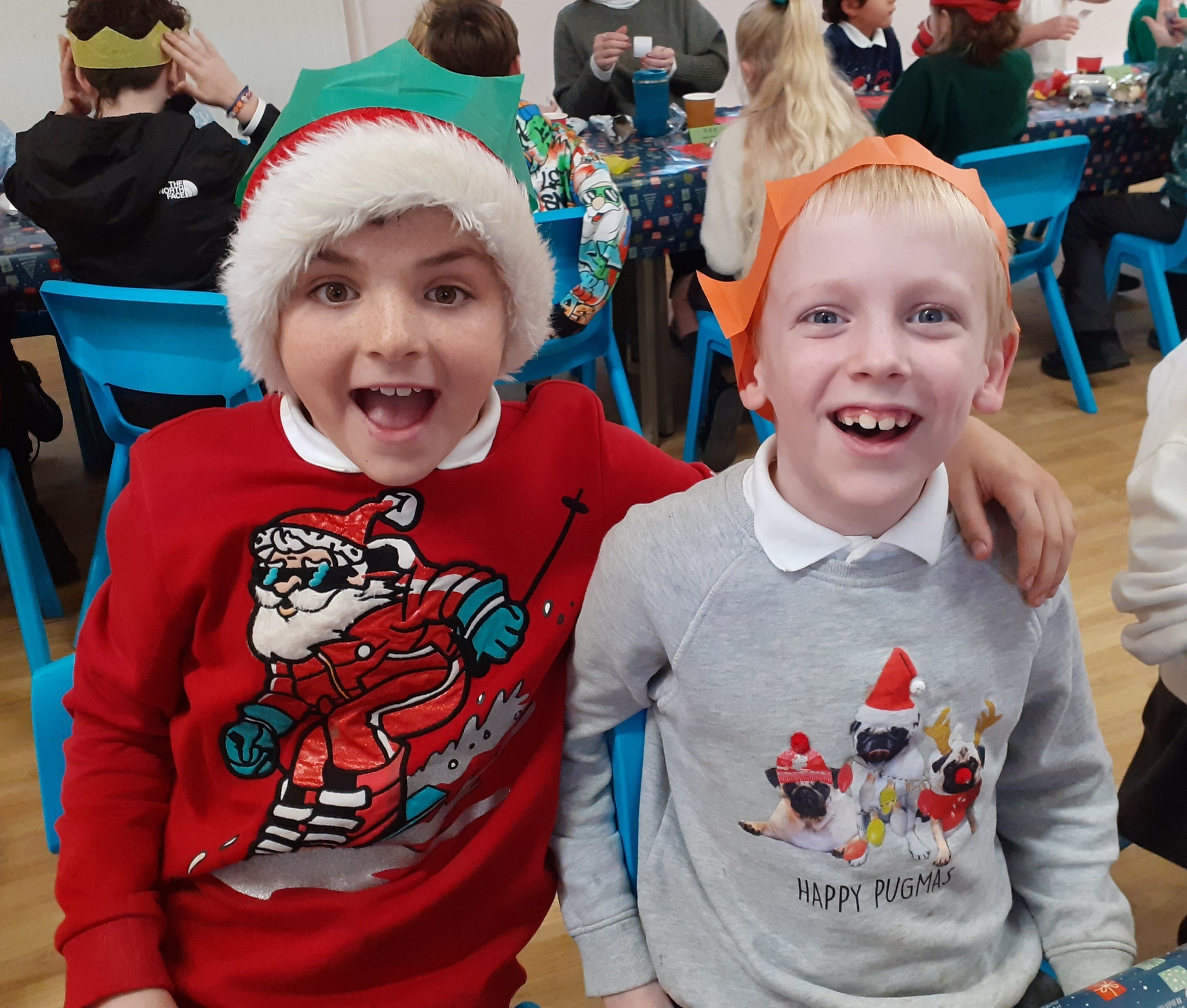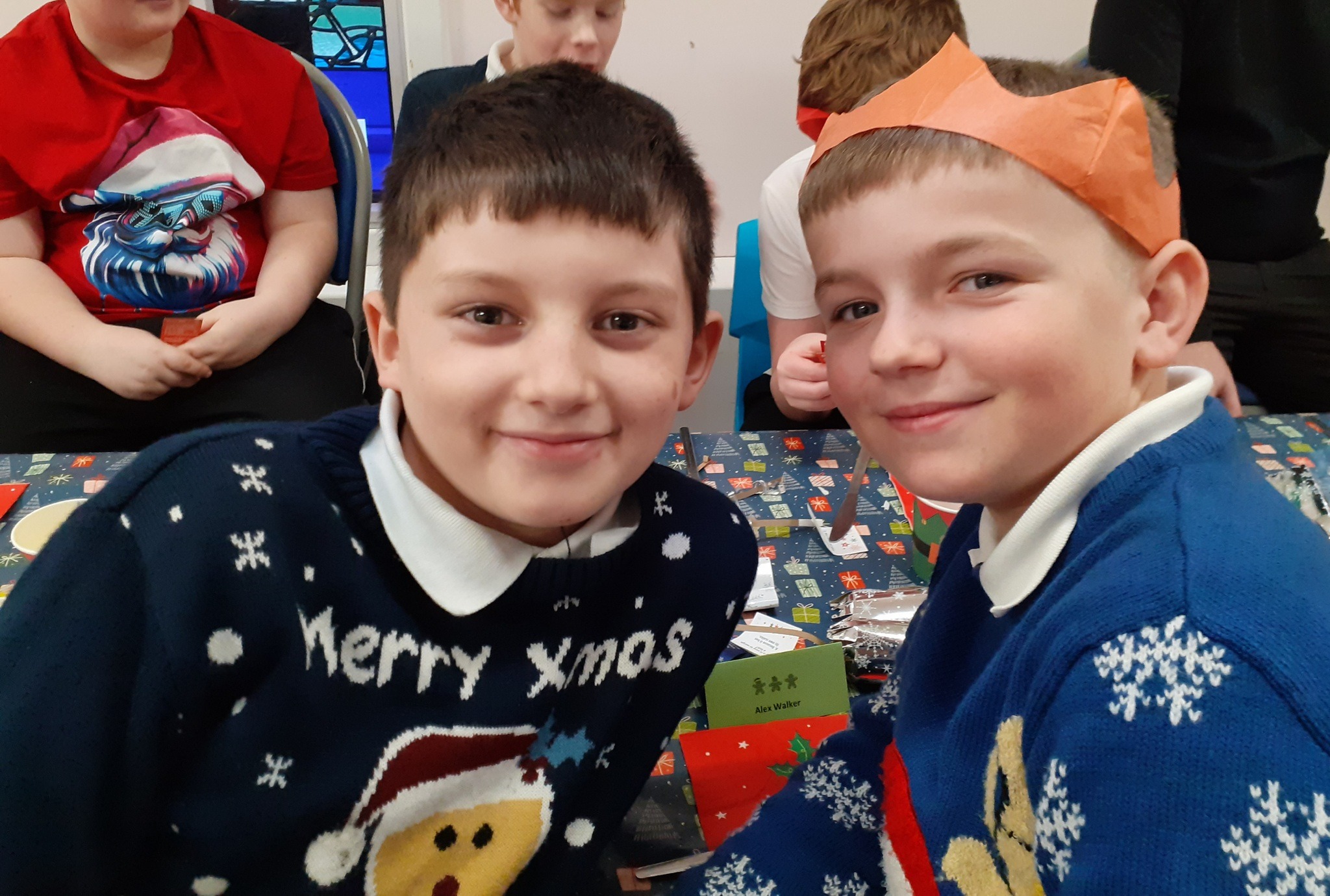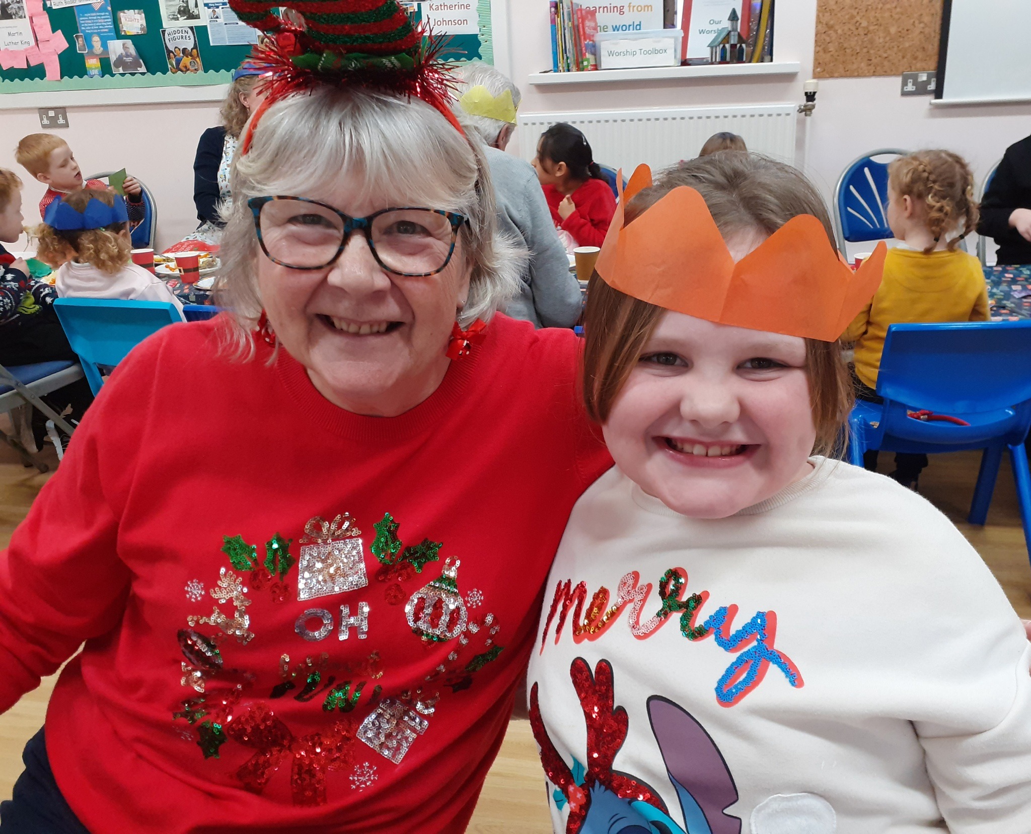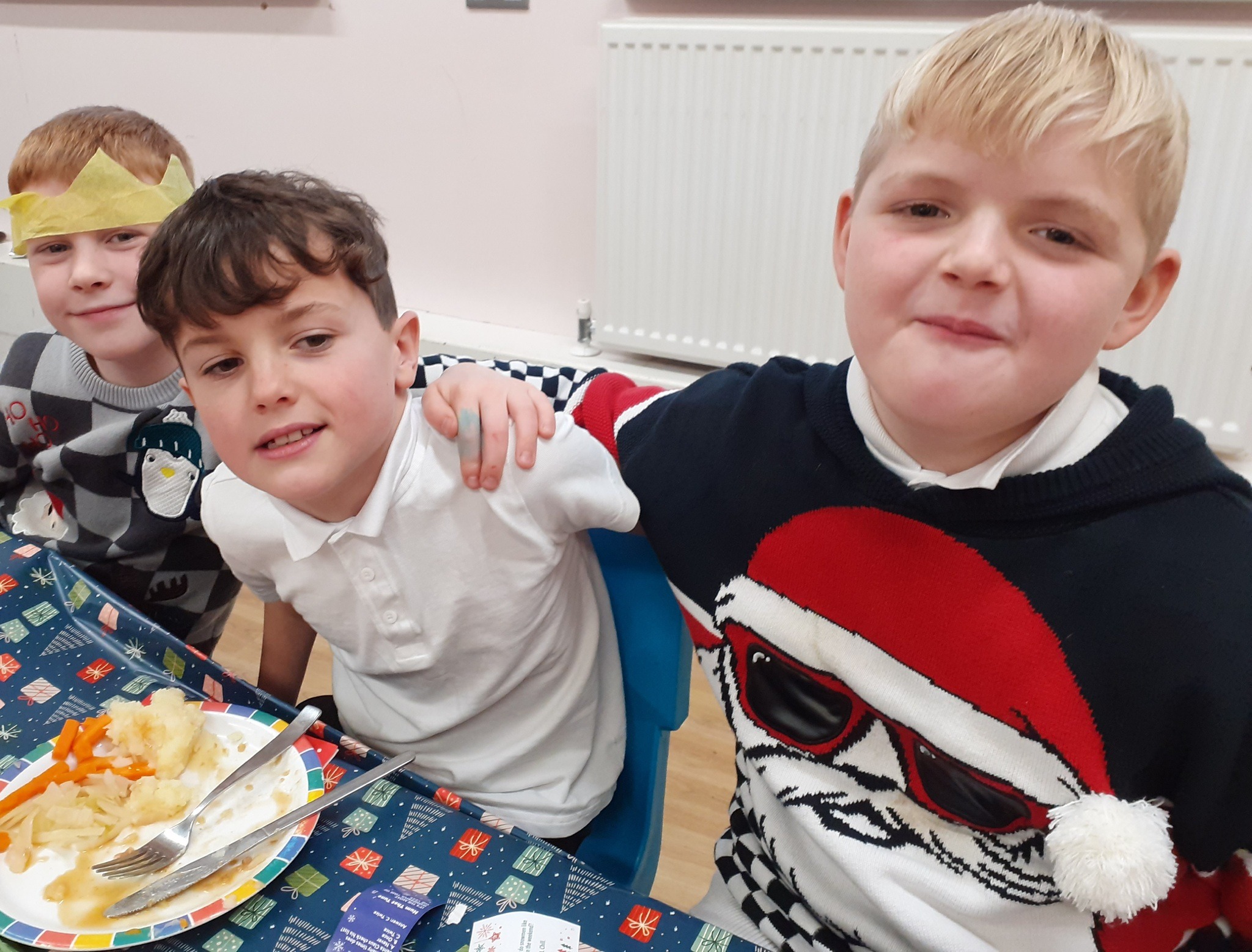 What a great Christmas dinner we ate today! We love our party day; prior to class parties we have a whole school Christmas Dinner where our school community sit together, as you can see in the photos, and our wonderful cook Mrs Billington makes a full Christmas dinner which we all thoroughly enjoy. An extra kindness is that members of our Friends Association kindly volunteer to serve the food too which is a lovely touch. Thank you so much Mrs Billington and our Friends.