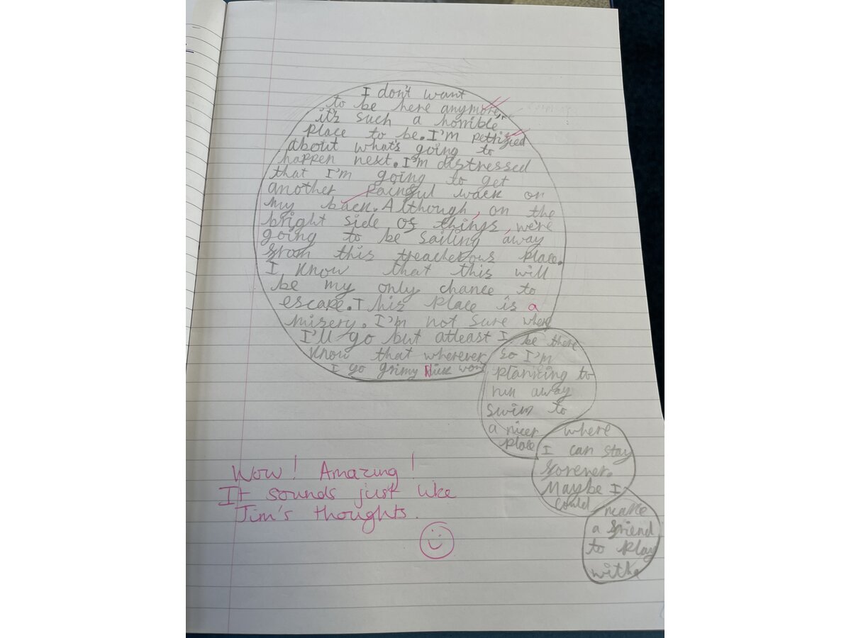 We then used these images and words to create a thought bubble for the main character, Jim. There was lots of exploring the language of the novel and use of thesauruses to write lists of useful adjectives so that what the children came up with was extremely emotional to read! I have added a couple of these pieces of writing to our gallery too. Well done particularly to Lilly and Abigail.