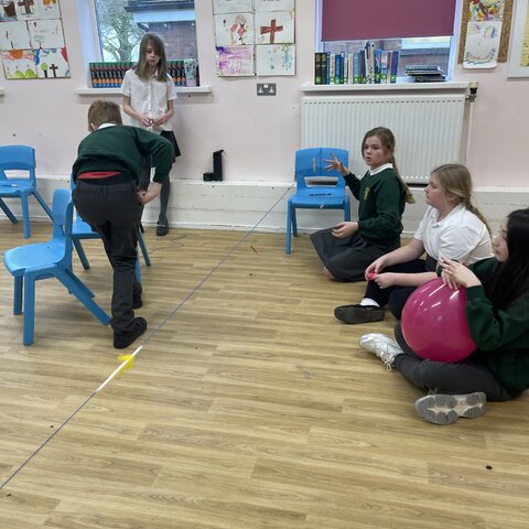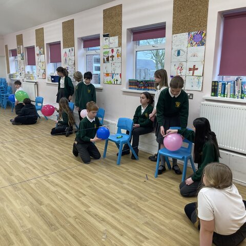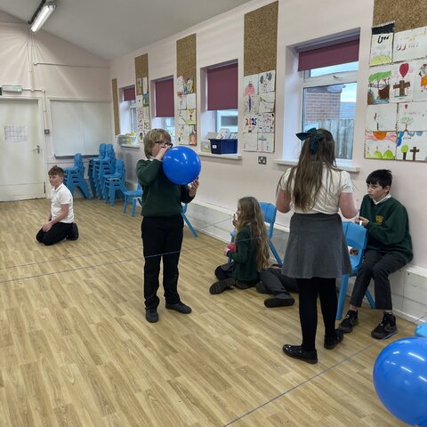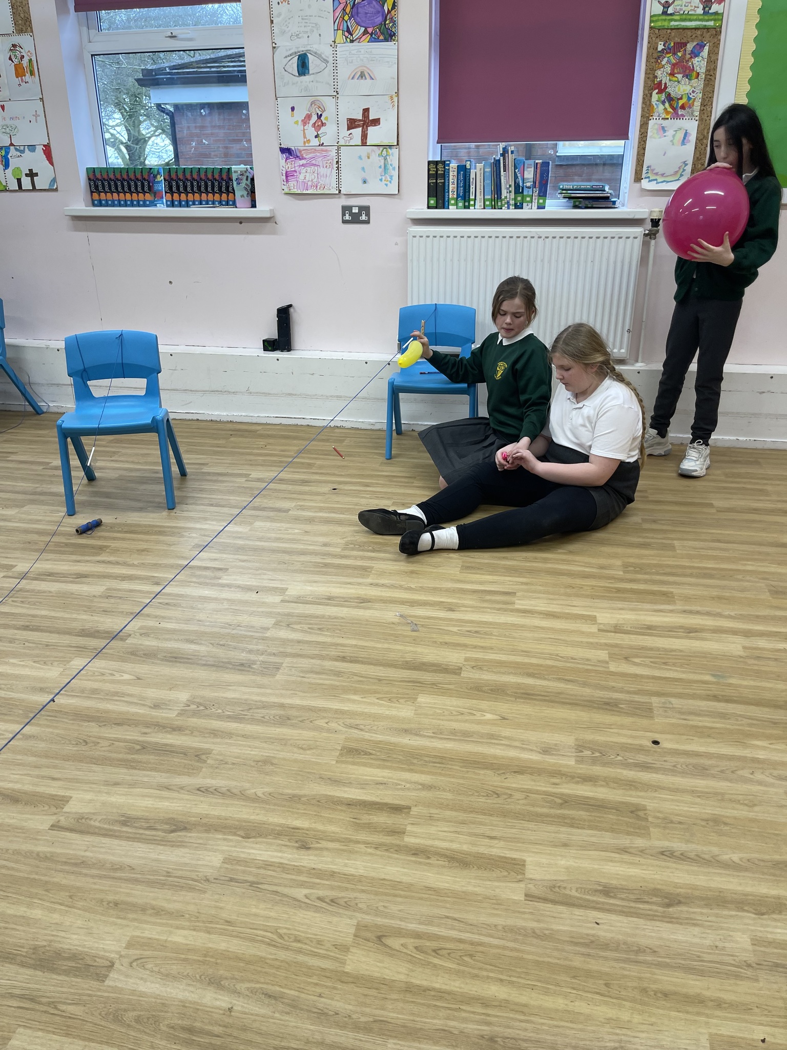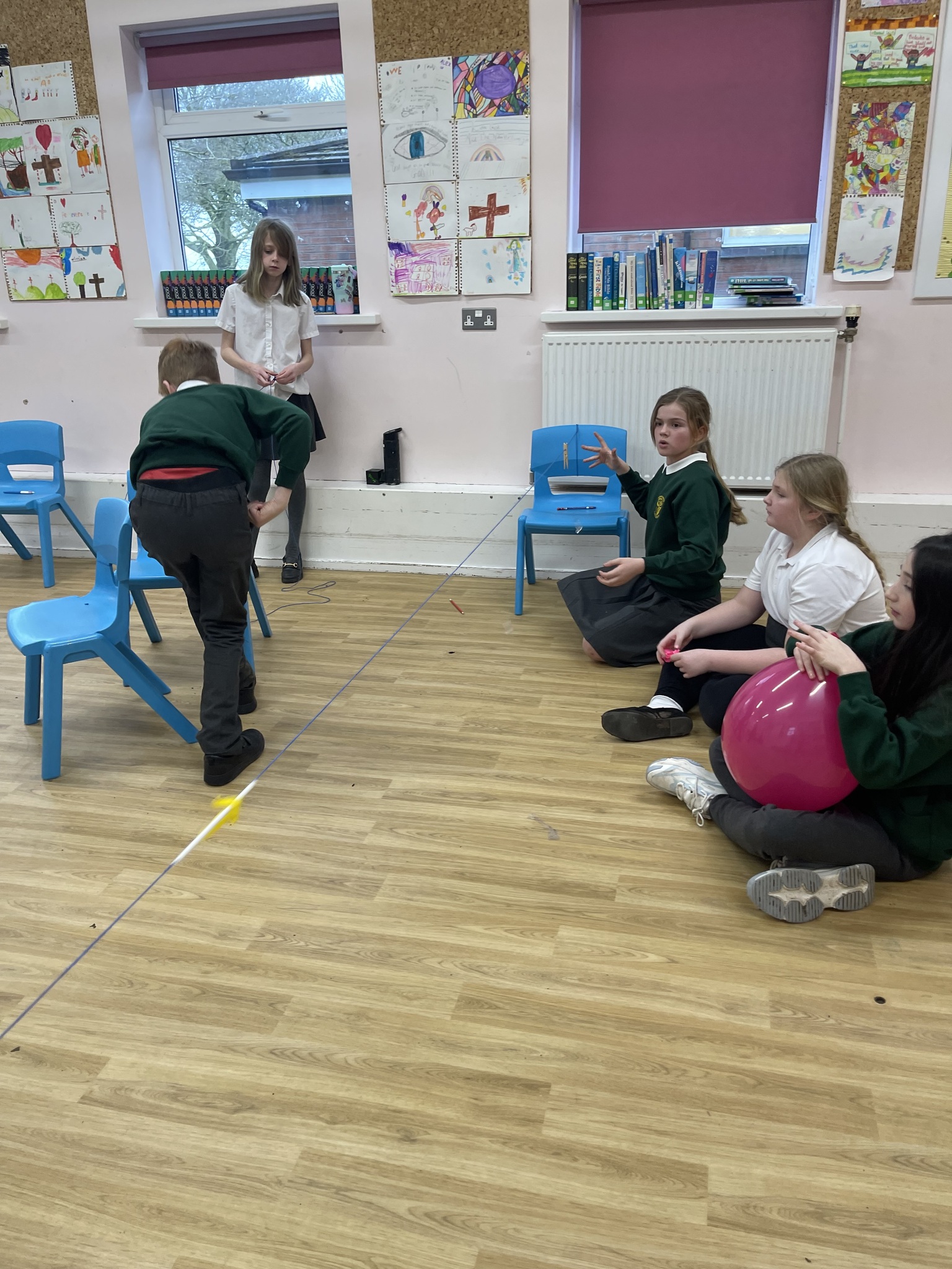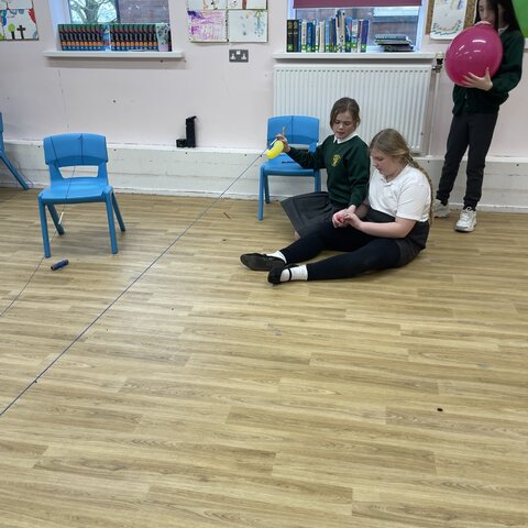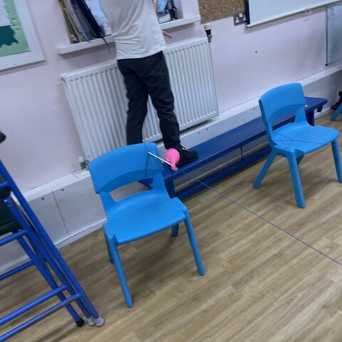 Today the class explored air resistance and the force of surface friction by making balloon rockets out of different shaped balloons and using different types to string to make their balloon rockets move. They discovered that friction slows objects down and stops them; they discussed how smoother string made their rockets move more quickly. They also noticed that the long thin balloons moved more quickly along the string because they had a more streamlined shape that reduced air resistance.